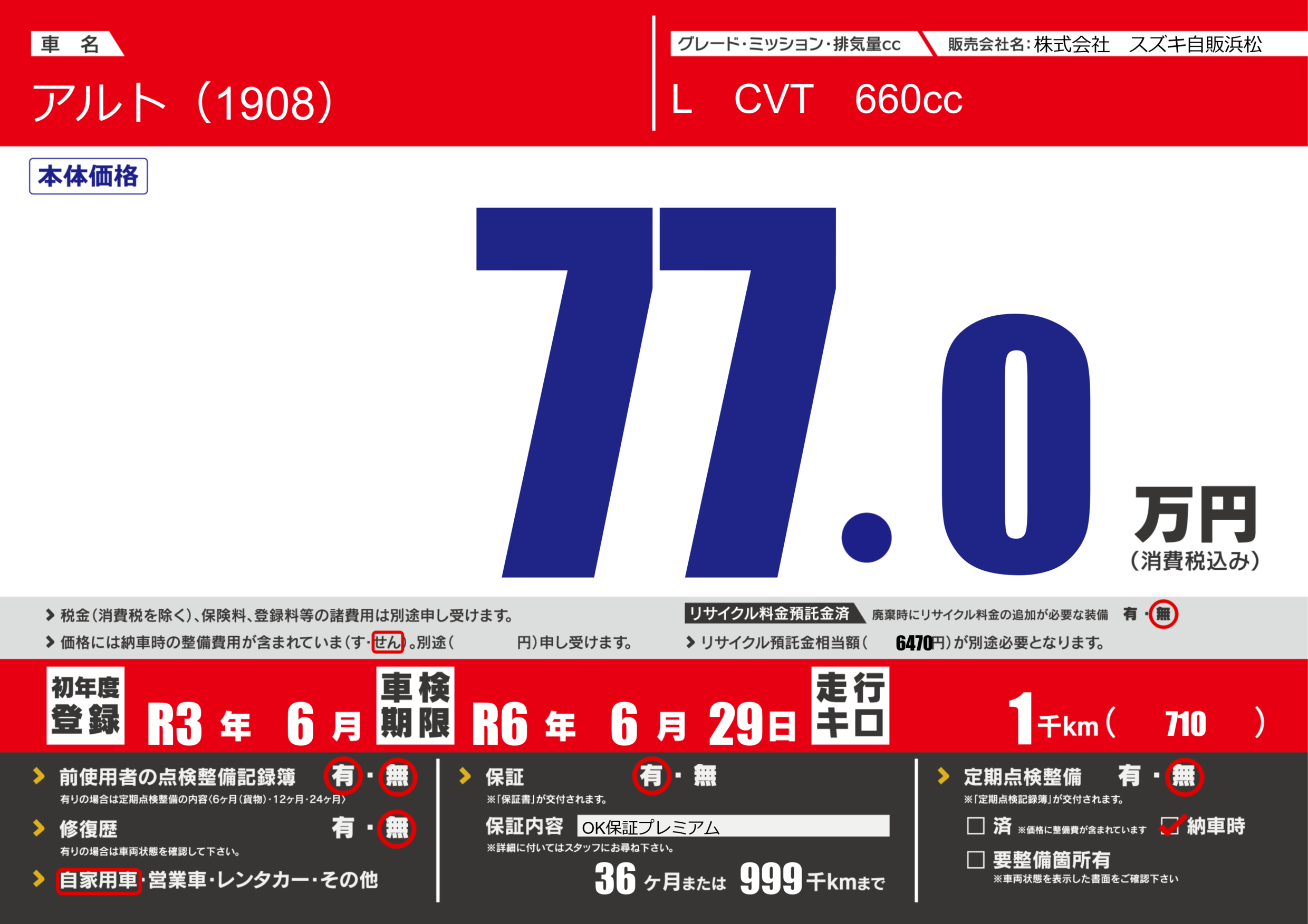 保証付き 保証内容(OK保証プレミアム) 36ヶ月または(999)千kmまで |