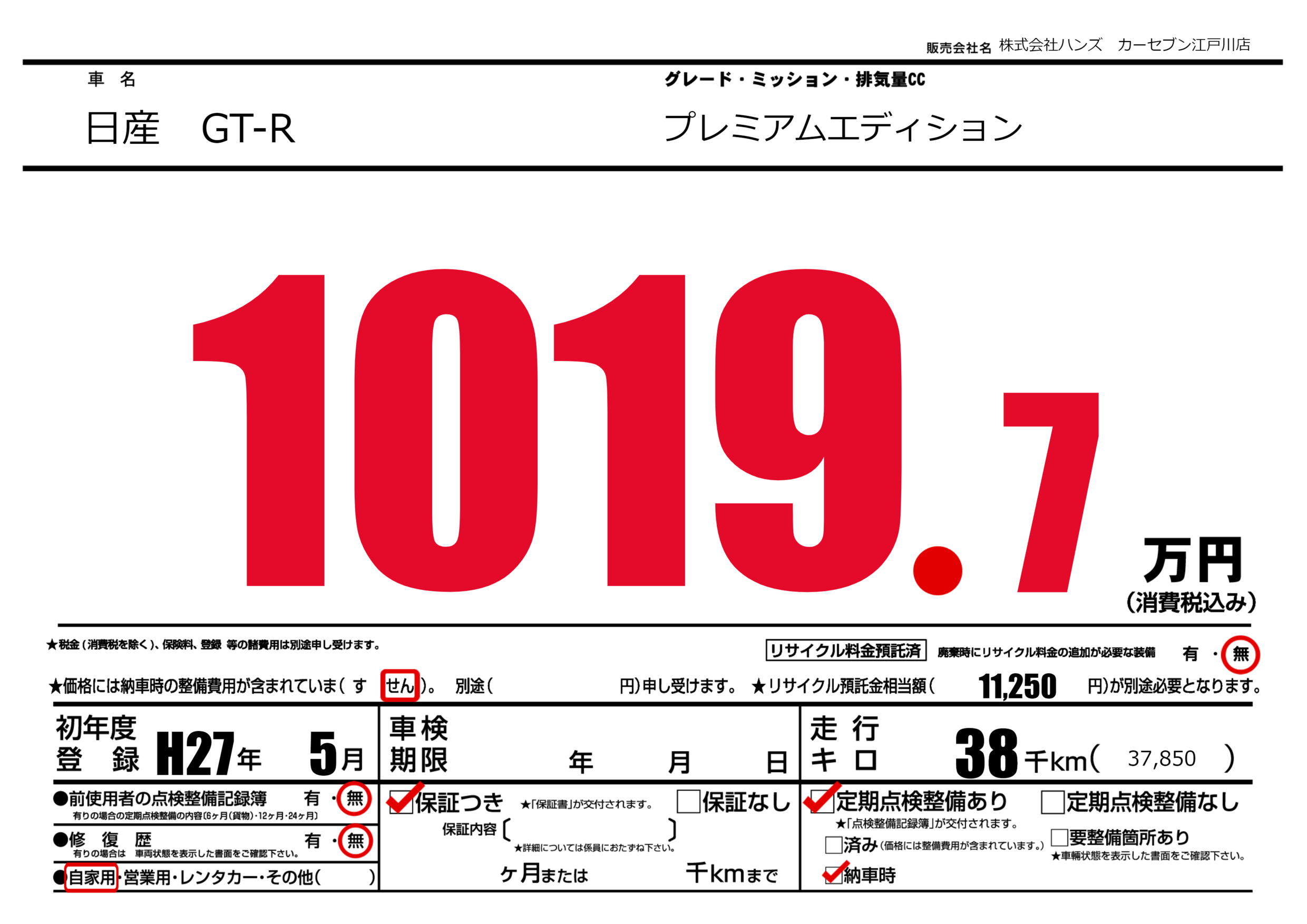 | 車名 | 日産 GT-R | グレード ミッション 排気量 |