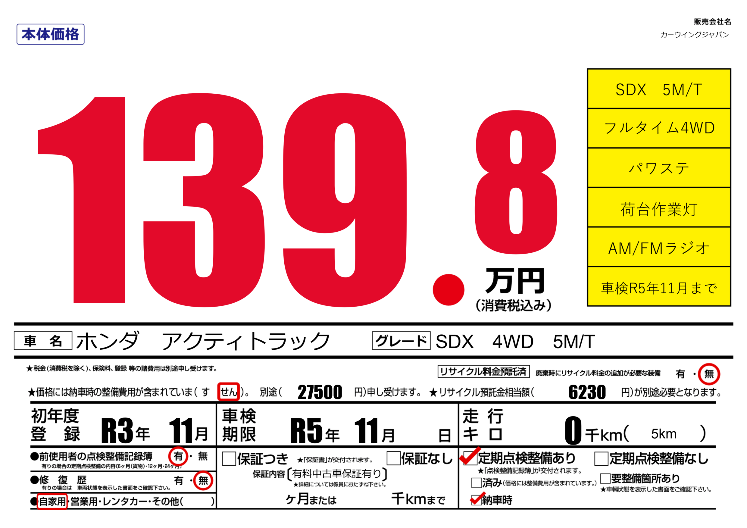 保証なし 保証内容(有料中古車保証有り) ---ヶ月または()千kmまで |