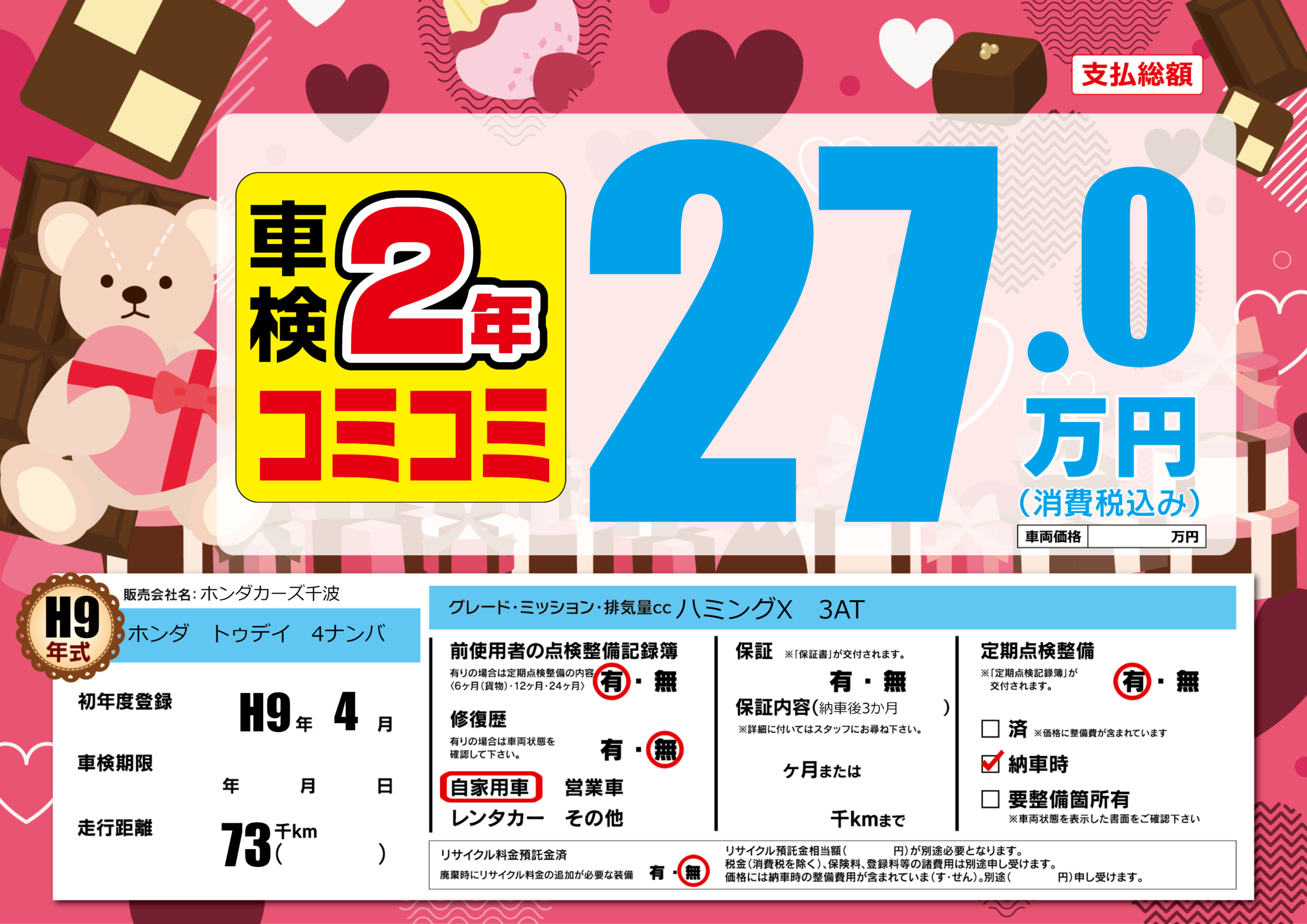 保証なし 保証内容(納車後3か月) ---ヶ月または()千kmまで |