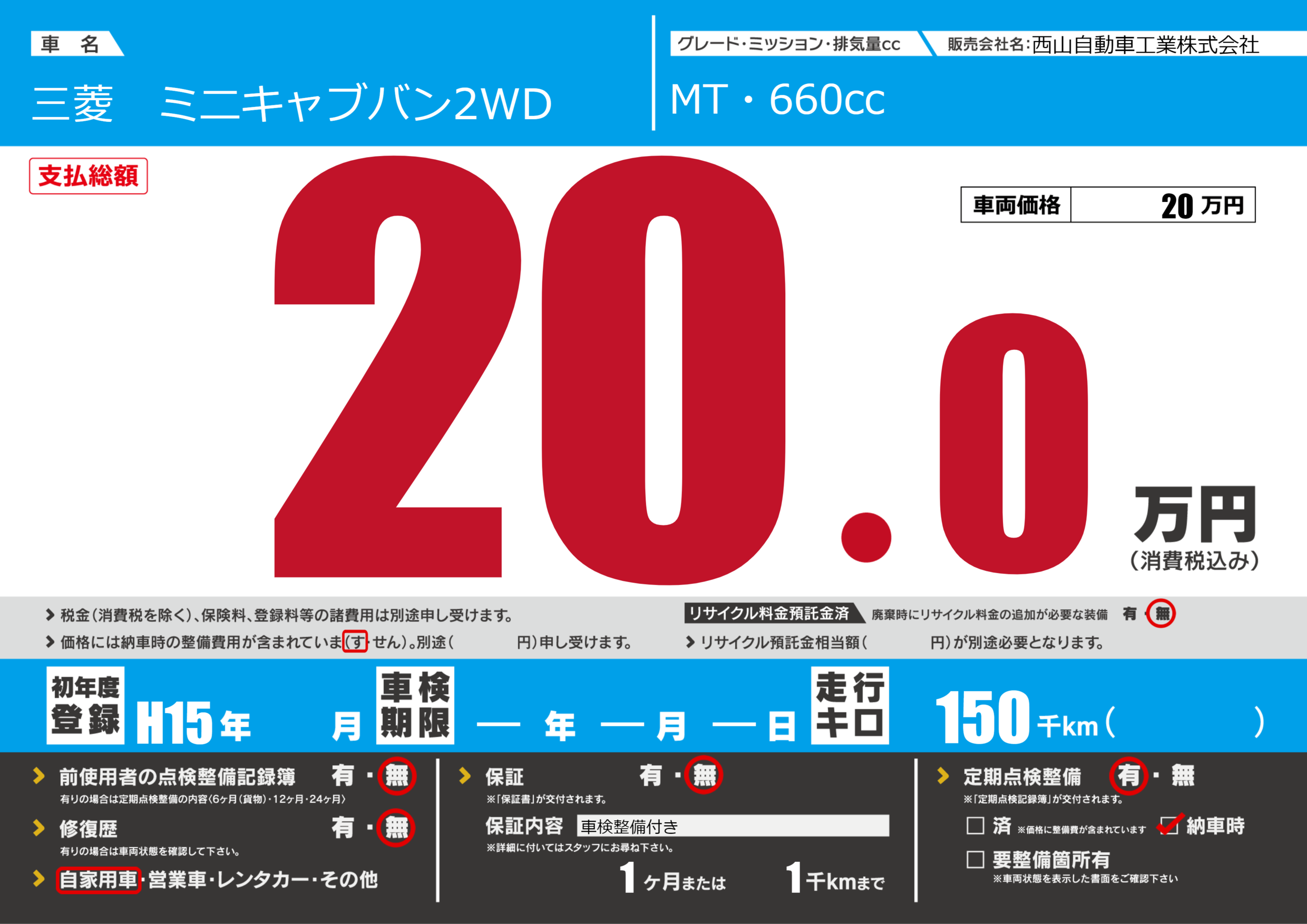 保証なし 保証内容(車検整備付き) 1ヶ月または(1)千kmまで |