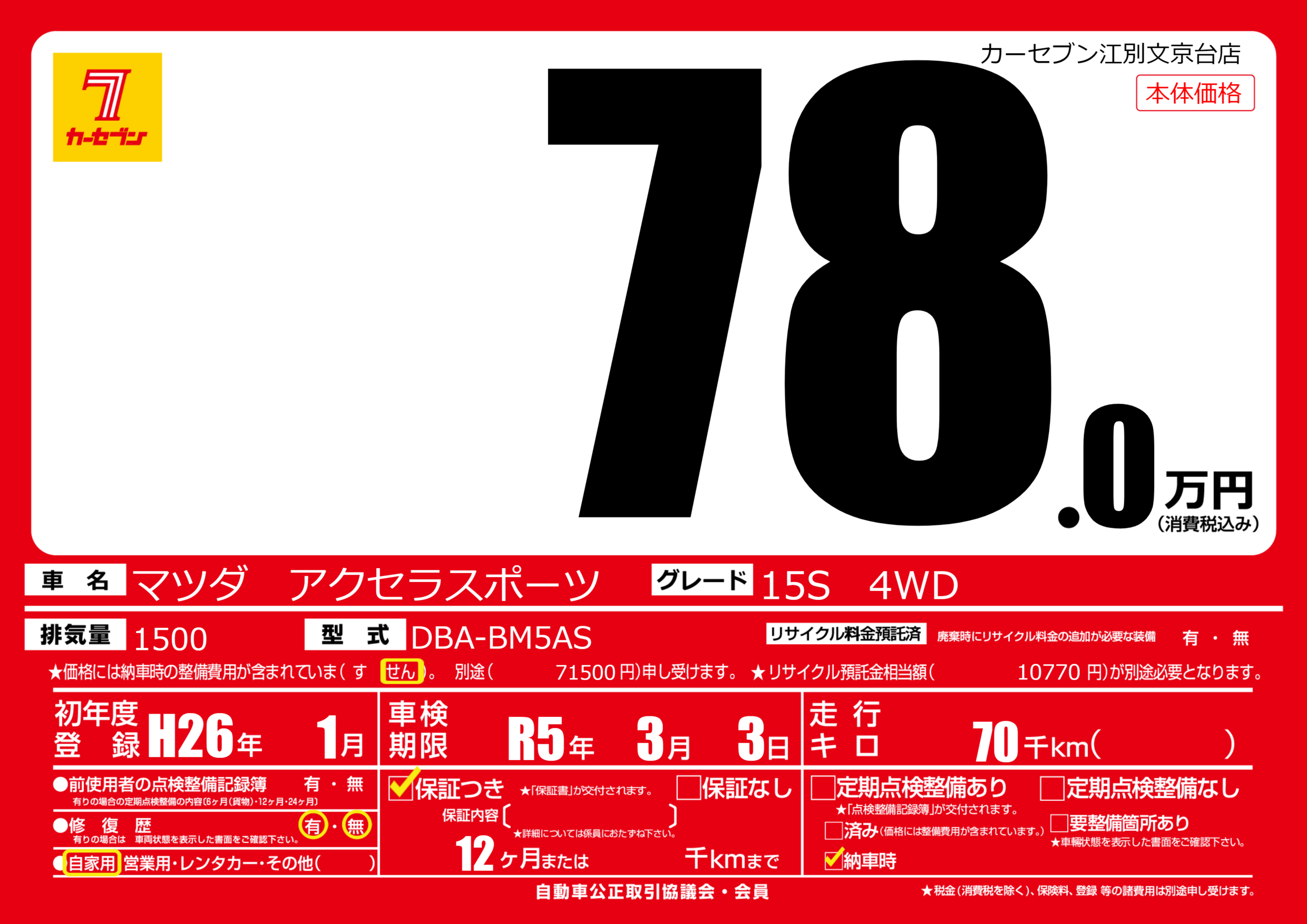 | 車名 | マツダ アクセラスポーツ | グレード ミッション 排気量 |