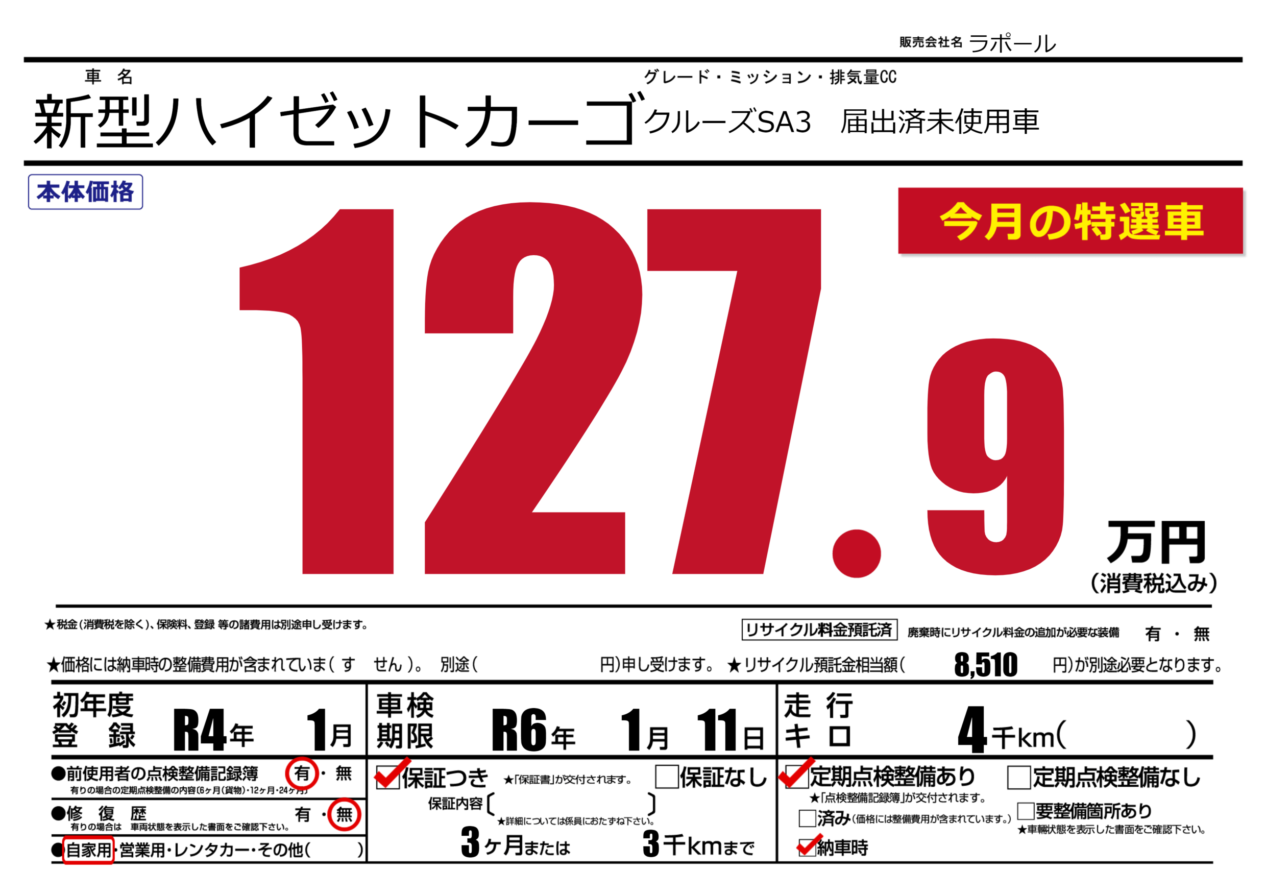 保証付き 保証内容(---) 3ヶ月または(3)千kmまで |