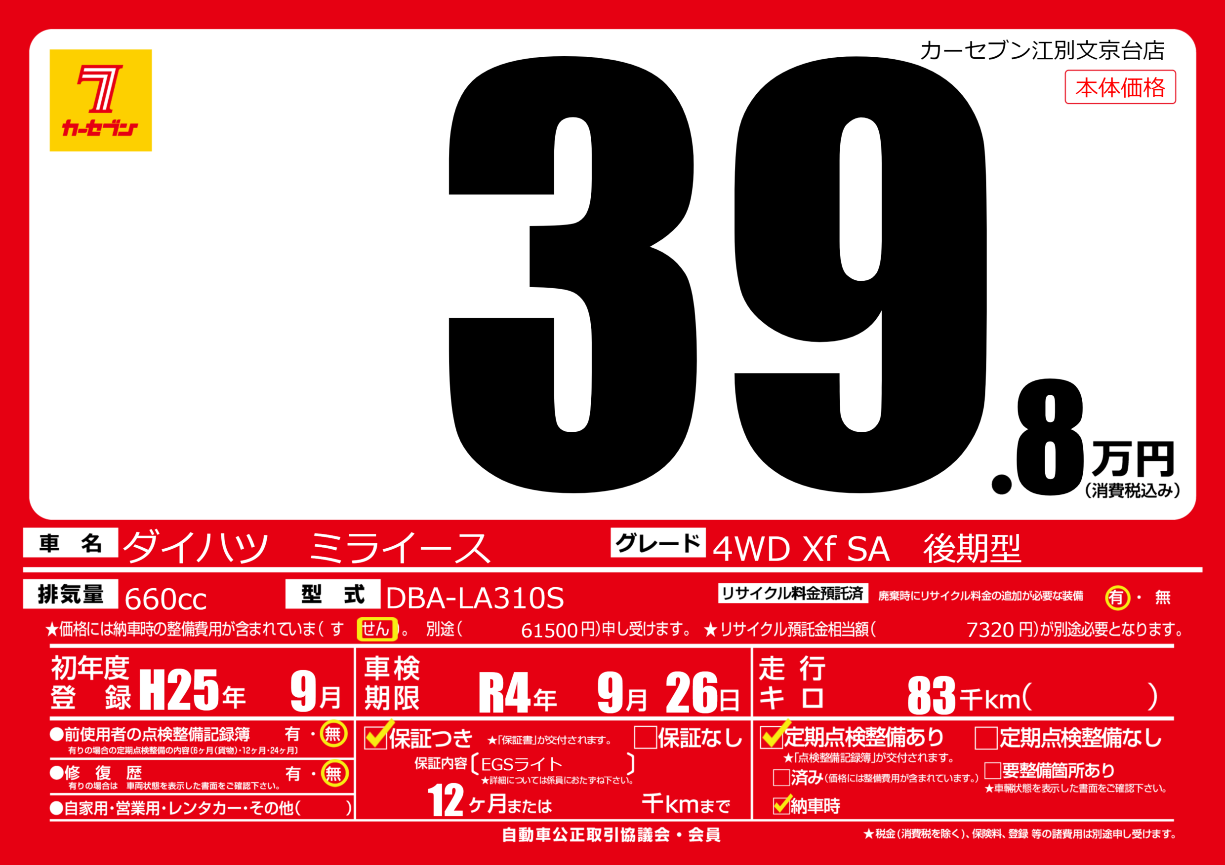 | 車検制限 | R4年 9月 26日 | ||