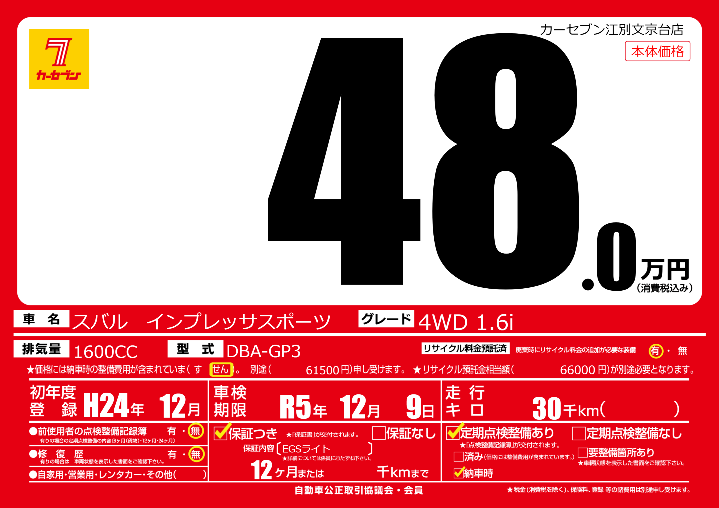 | 車名 | スバル インプレッサスポーツ | グレード ミッション 排気量 |
