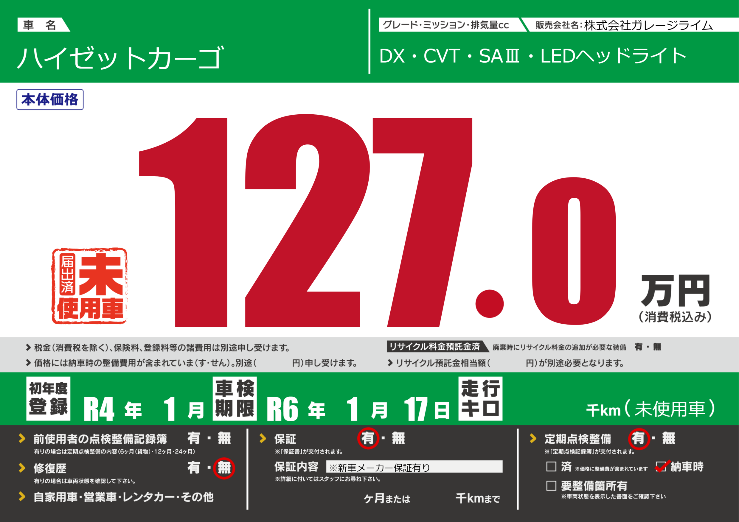 | 車名 | ハイゼットカーゴ | グレード ミッション 排気量 |