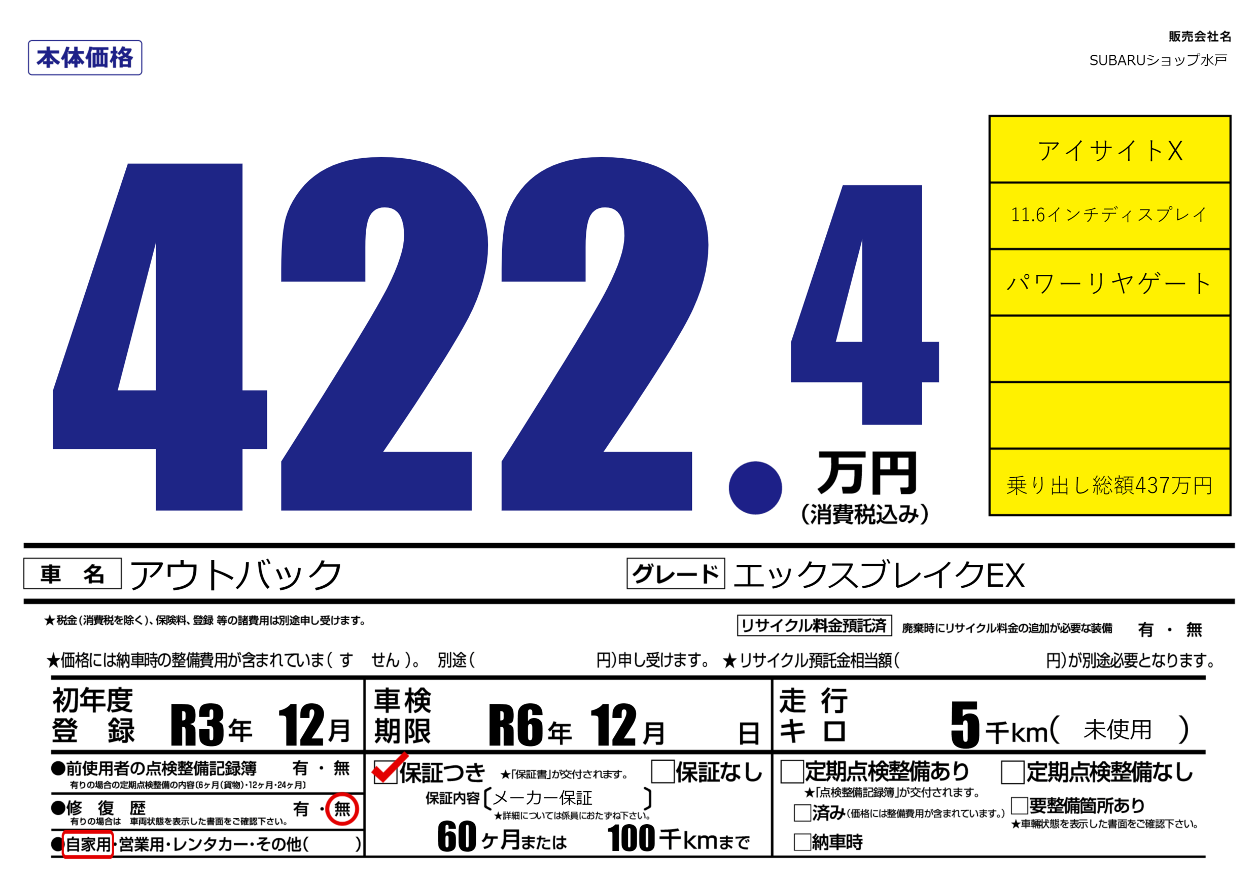 | 車名 | アウトバック | グレード ミッション 排気量 |