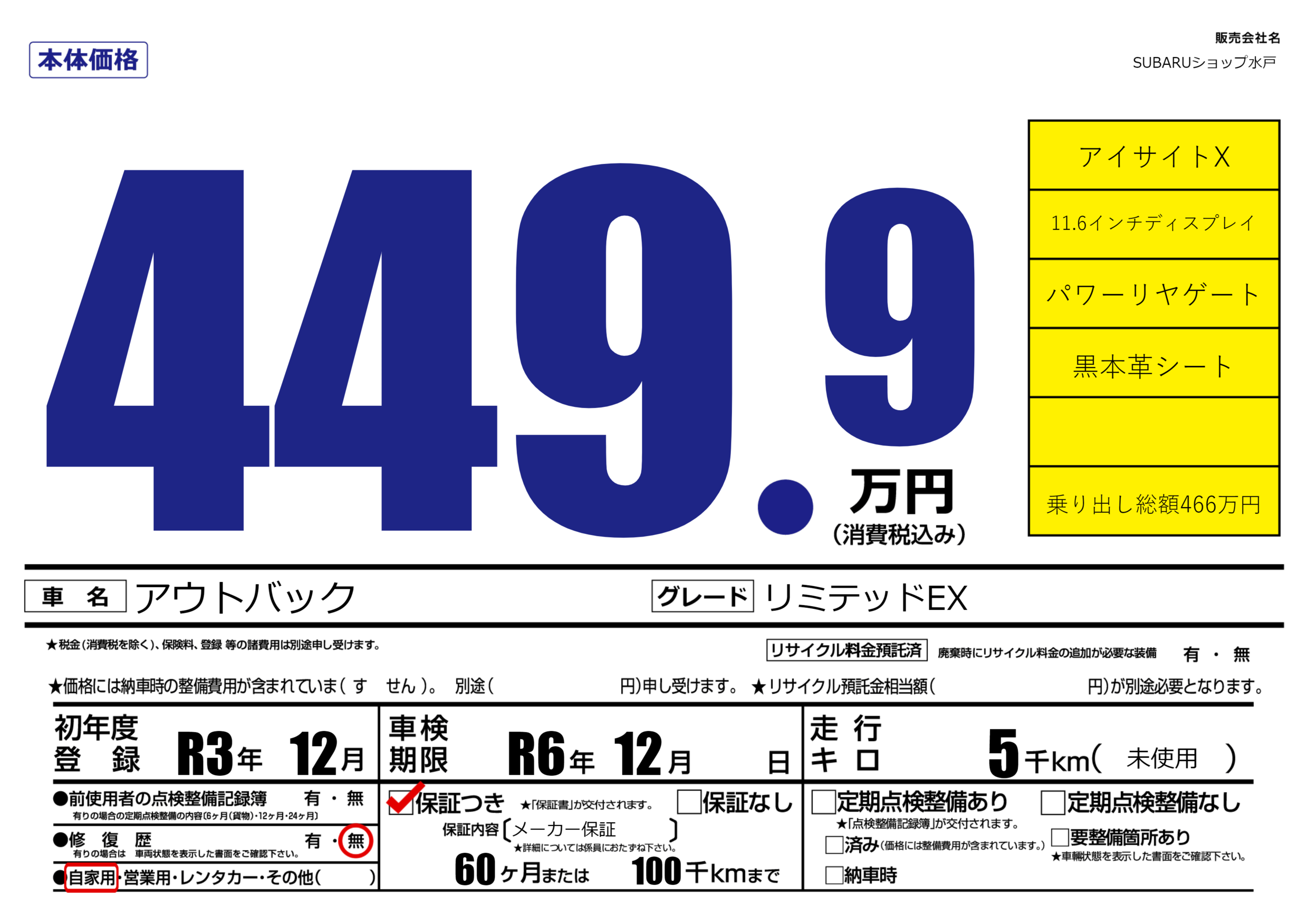 | 車名 | アウトバック | グレード ミッション 排気量 |