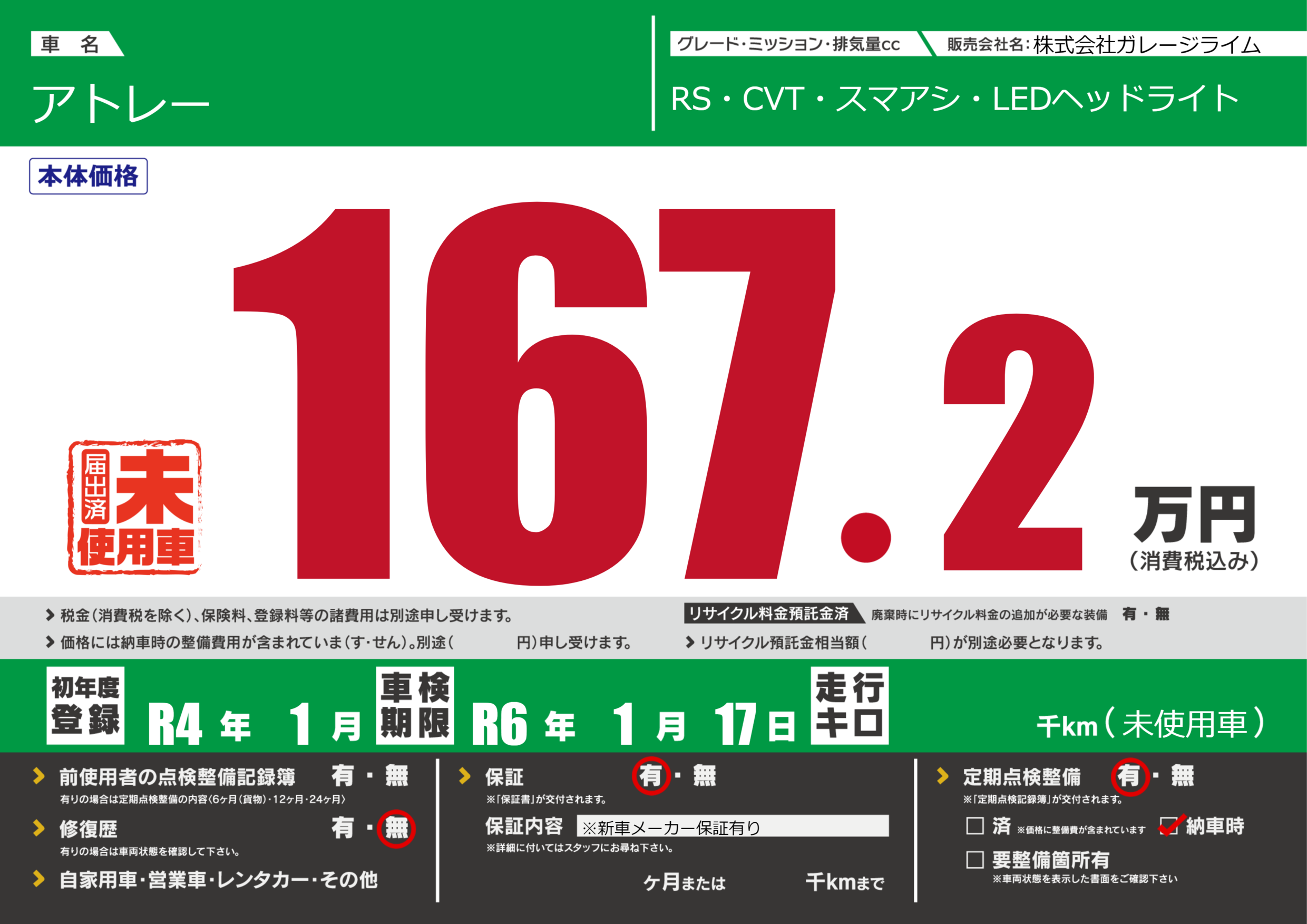 保証付き 保証内容(※新車メーカー保証有り) ヶ月または千km |