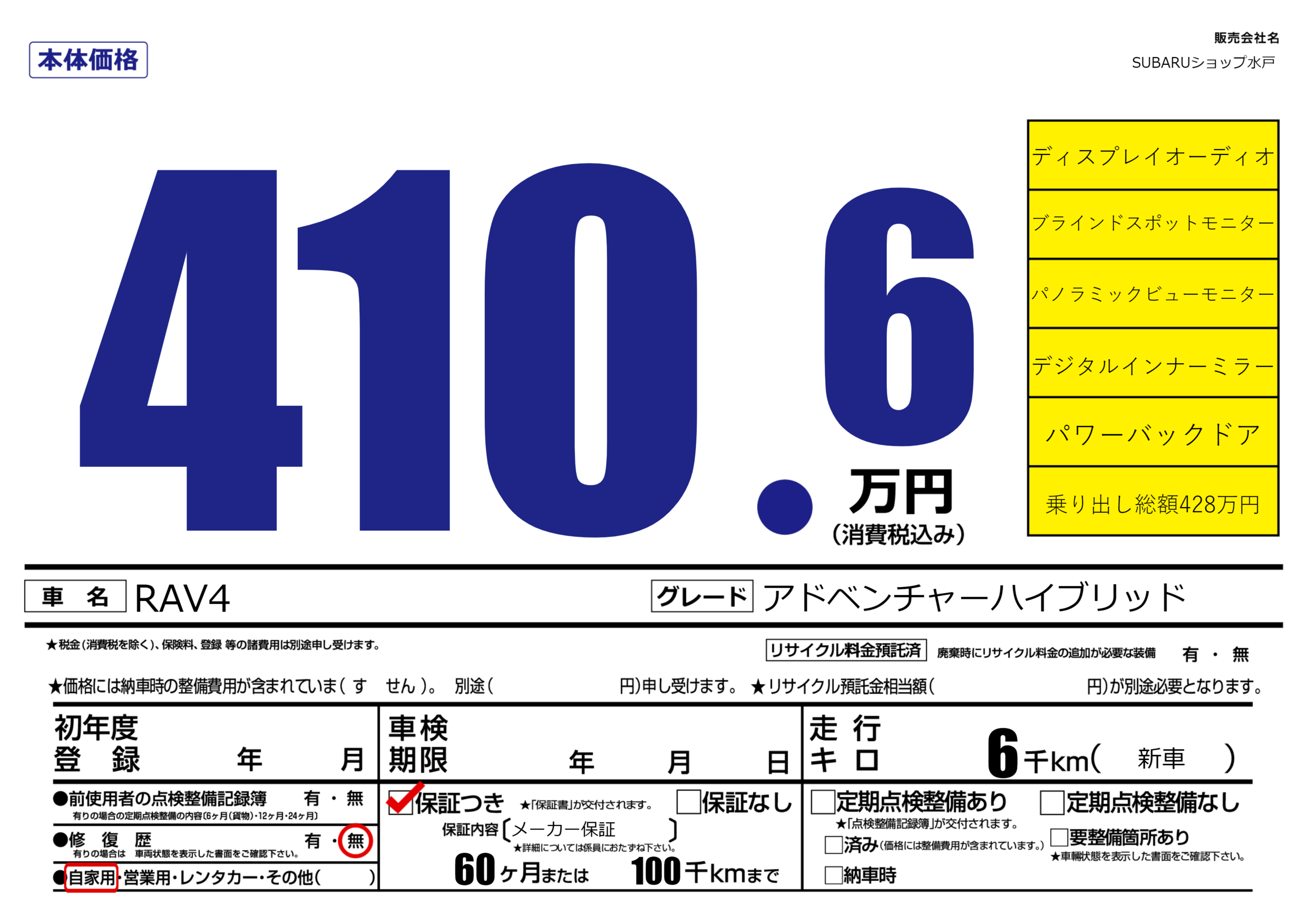 | 車名 | RAV4 | グレード ミッション 排気量 |