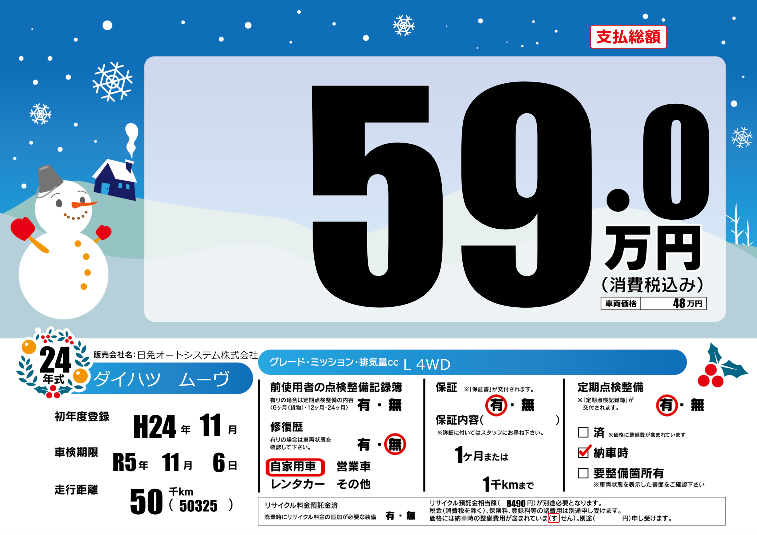| 走行キロ | 5万km | 初年度登録 | H24年11月 |