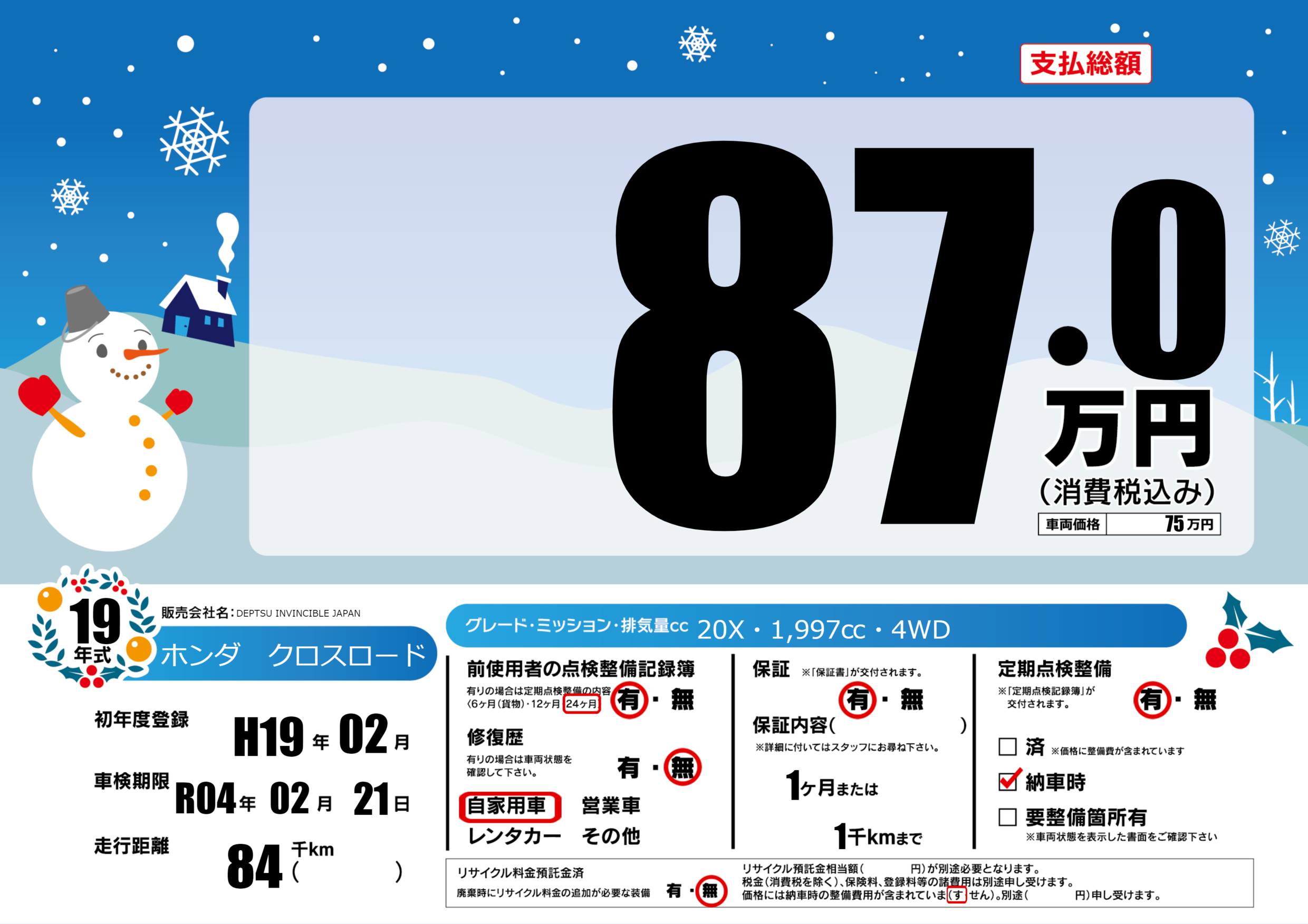 | 車名 | ホンダ クロスロード(売約済) | グレード ミッション 排気量 |