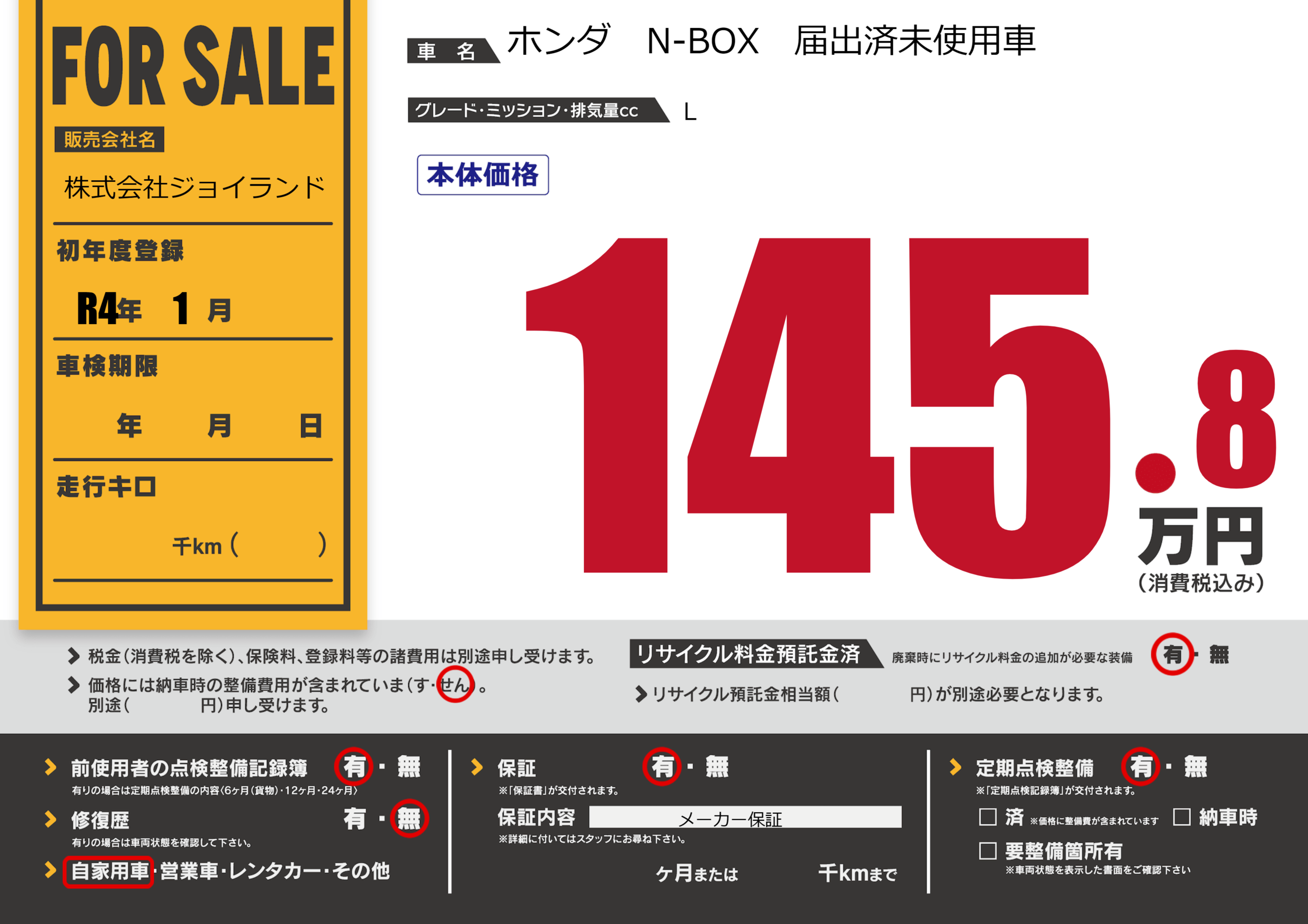 保証付き 保証内容( メーカー保証) ---ヶ月または()千kmまで |