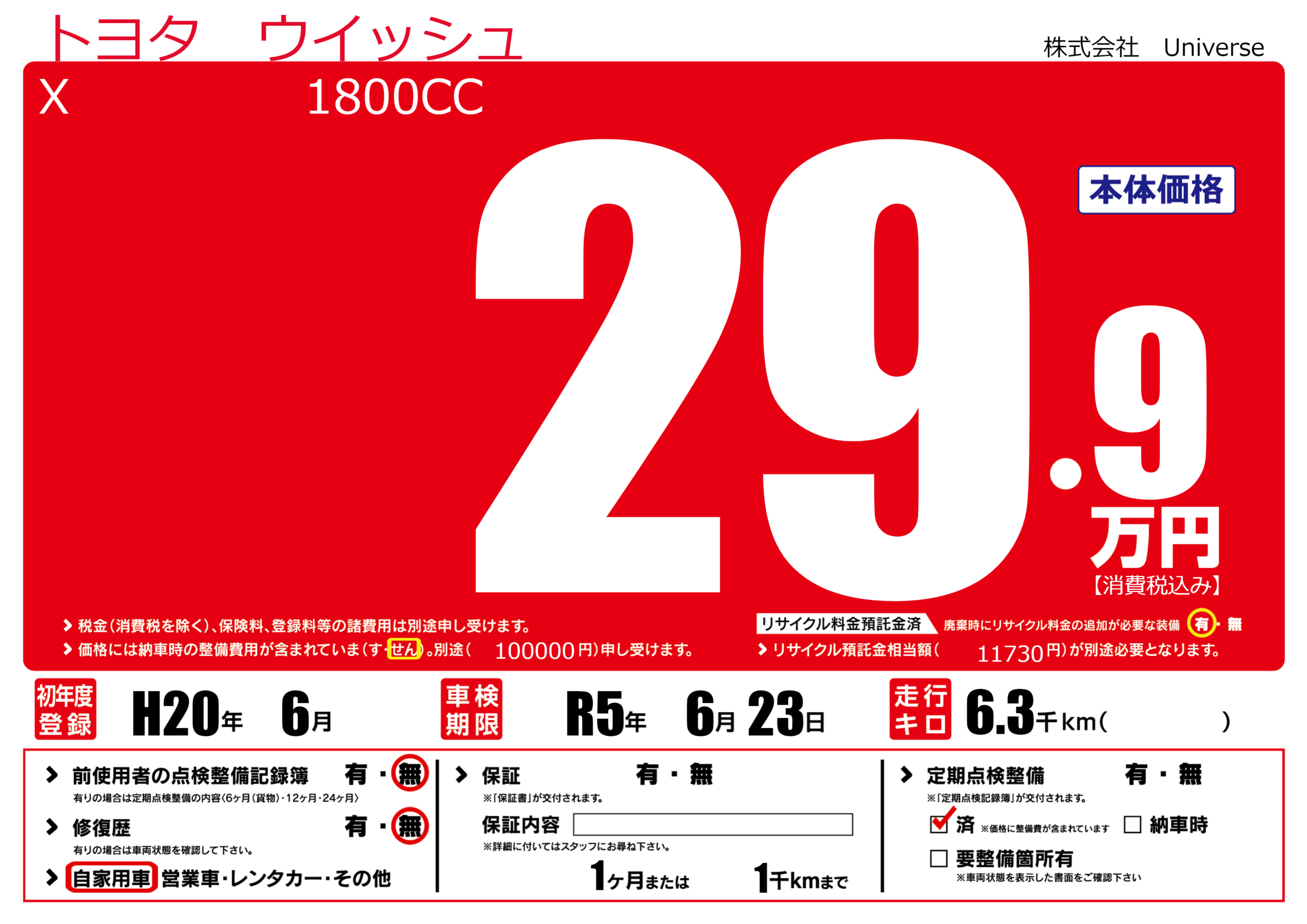 | 車名 | トヨタ ウイッシュ | グレード ミッション 排気量 |