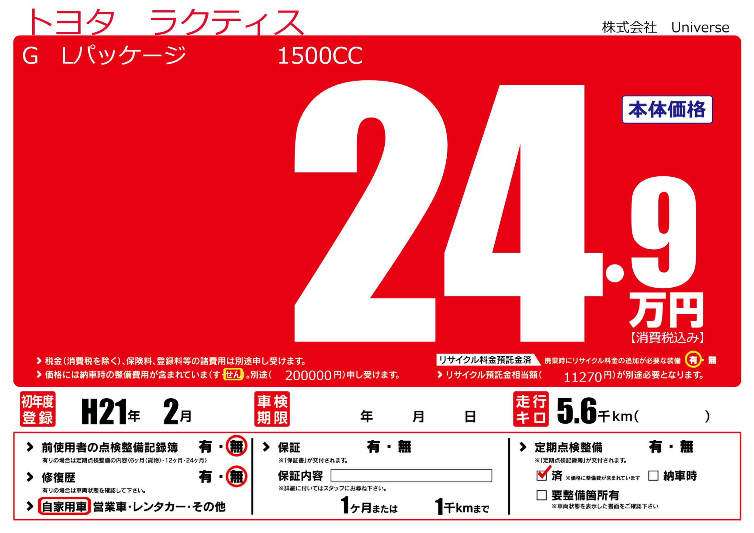 | 車名 | トヨタ ラクティス | グレード ミッション 排気量 |
