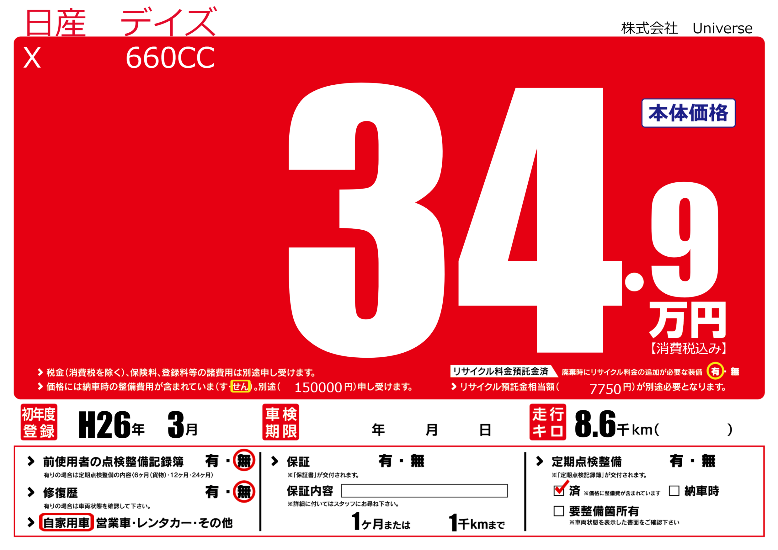 | 車名 | 日産 デイズ | グレード ミッション 排気量 |