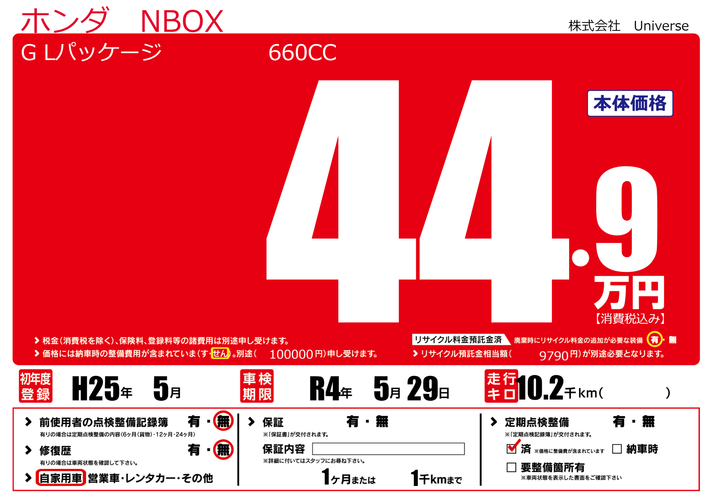 | 車名 | ホンダ NBOX | グレード ミッション 排気量 |