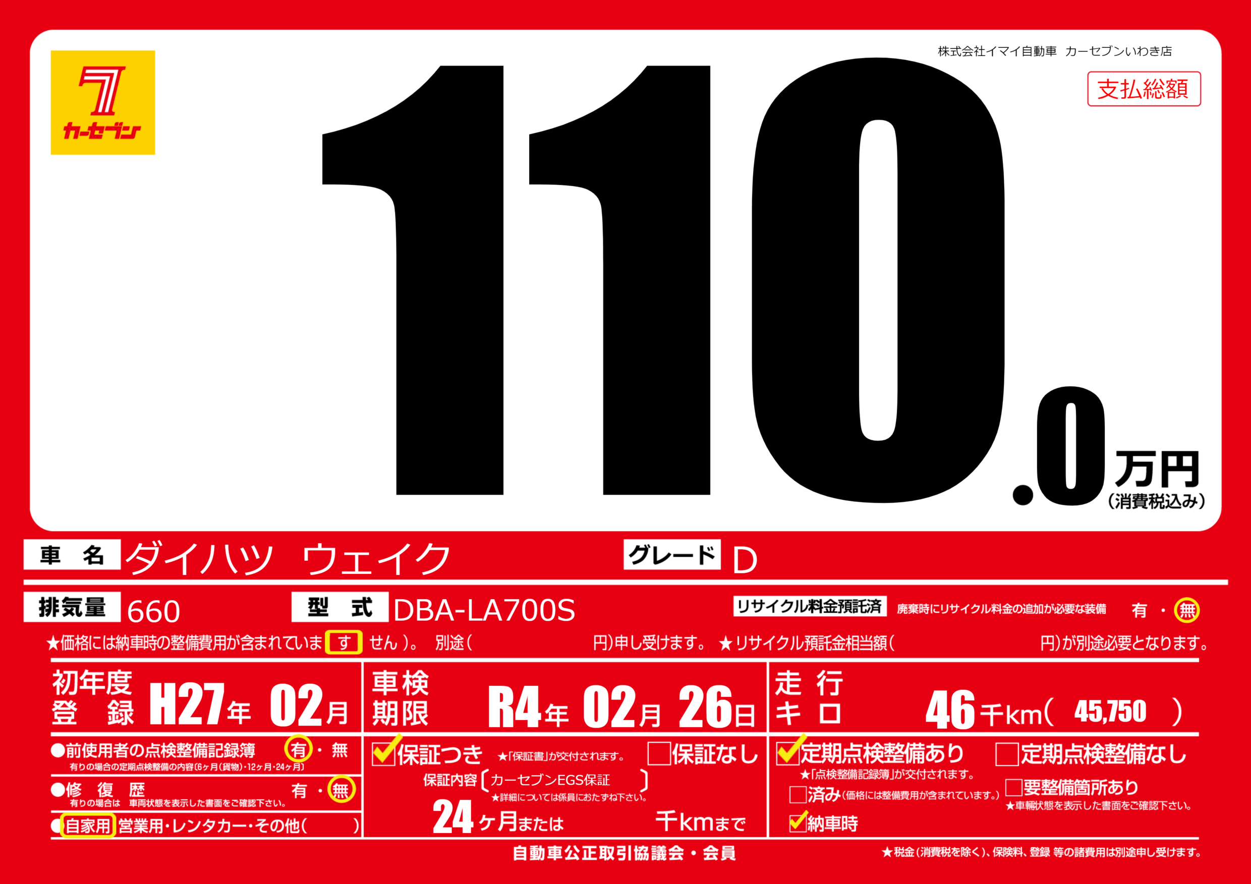 保証付き 保証内容(カーセブンEGS保証) 24ヶ月または()千kmまで |
