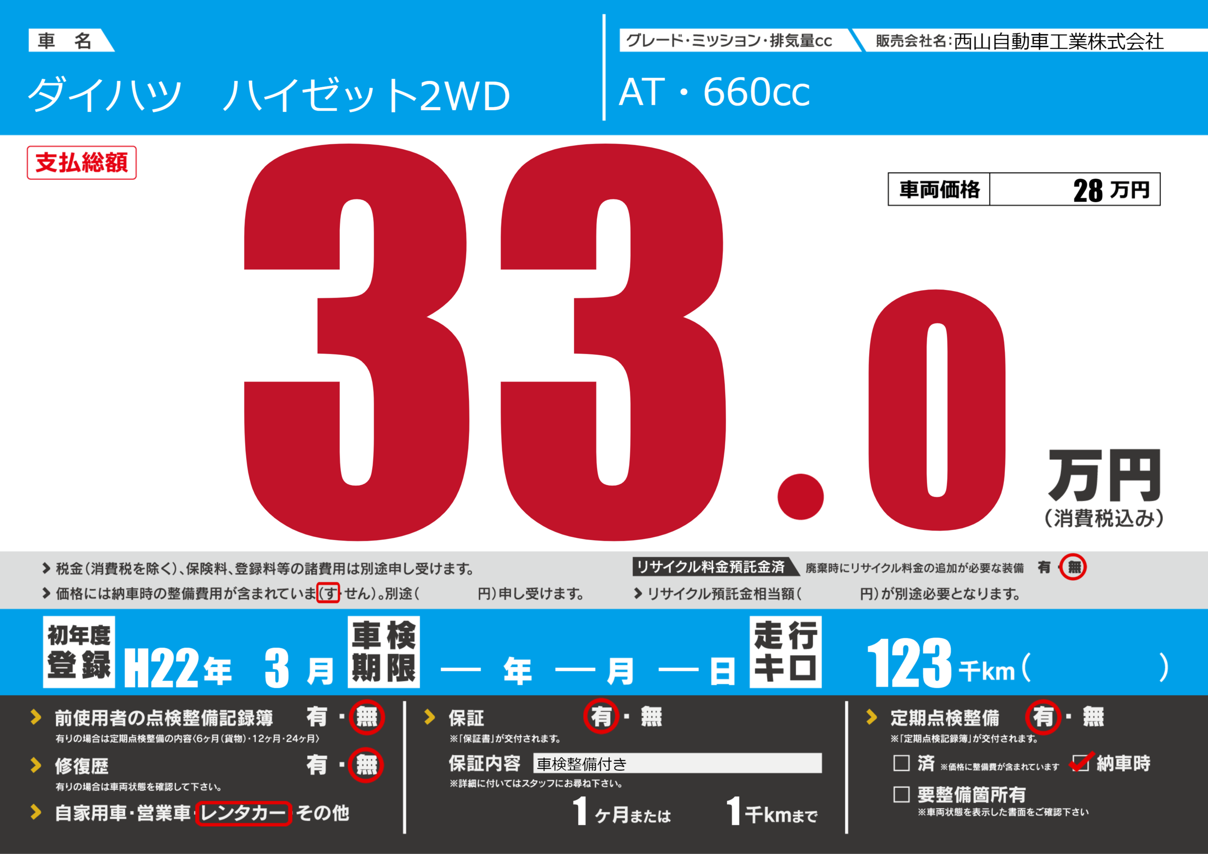 | 車名 | ダイハツ ハイゼット2WD | グレード ミッション 排気量 |