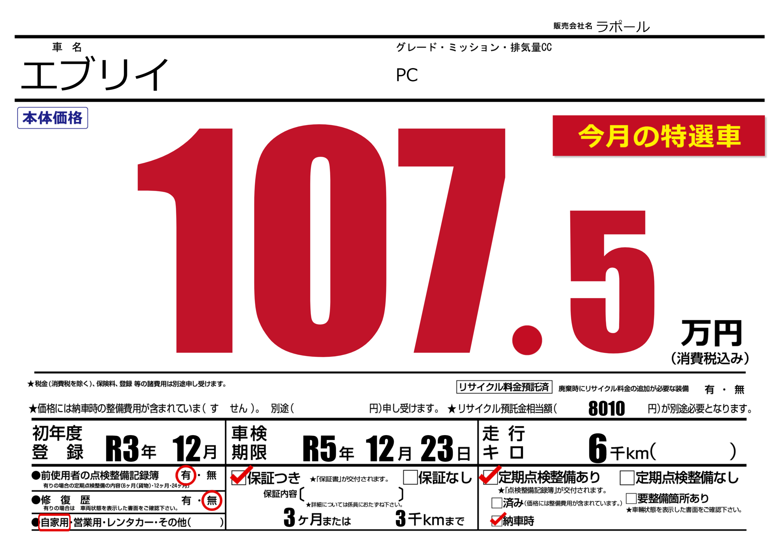 | 定期点検整備 | 定期点検整備あり 納車時あり | ||