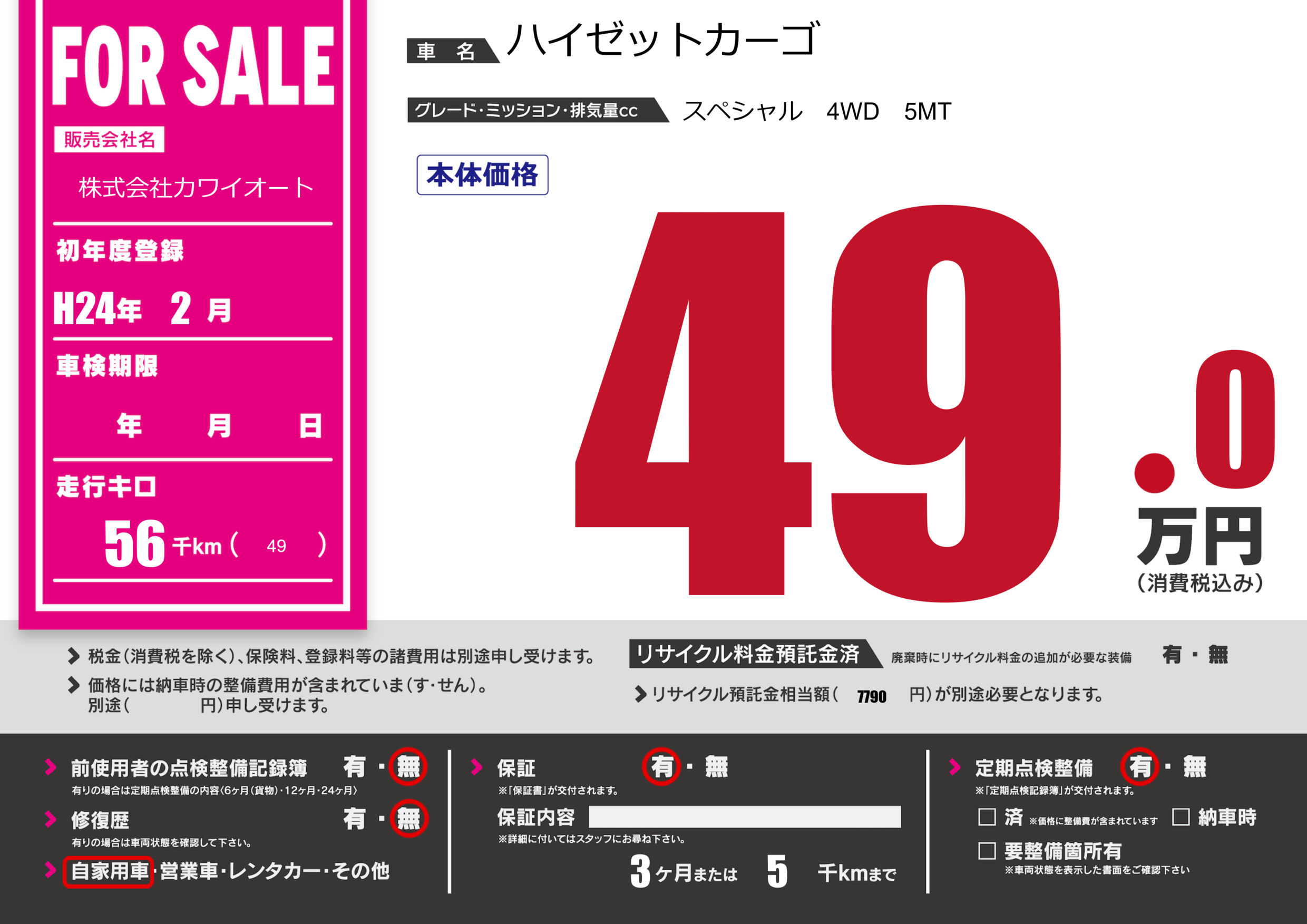 保証付き 保証内容(---) 3ヶ月または(5)千kmまで |