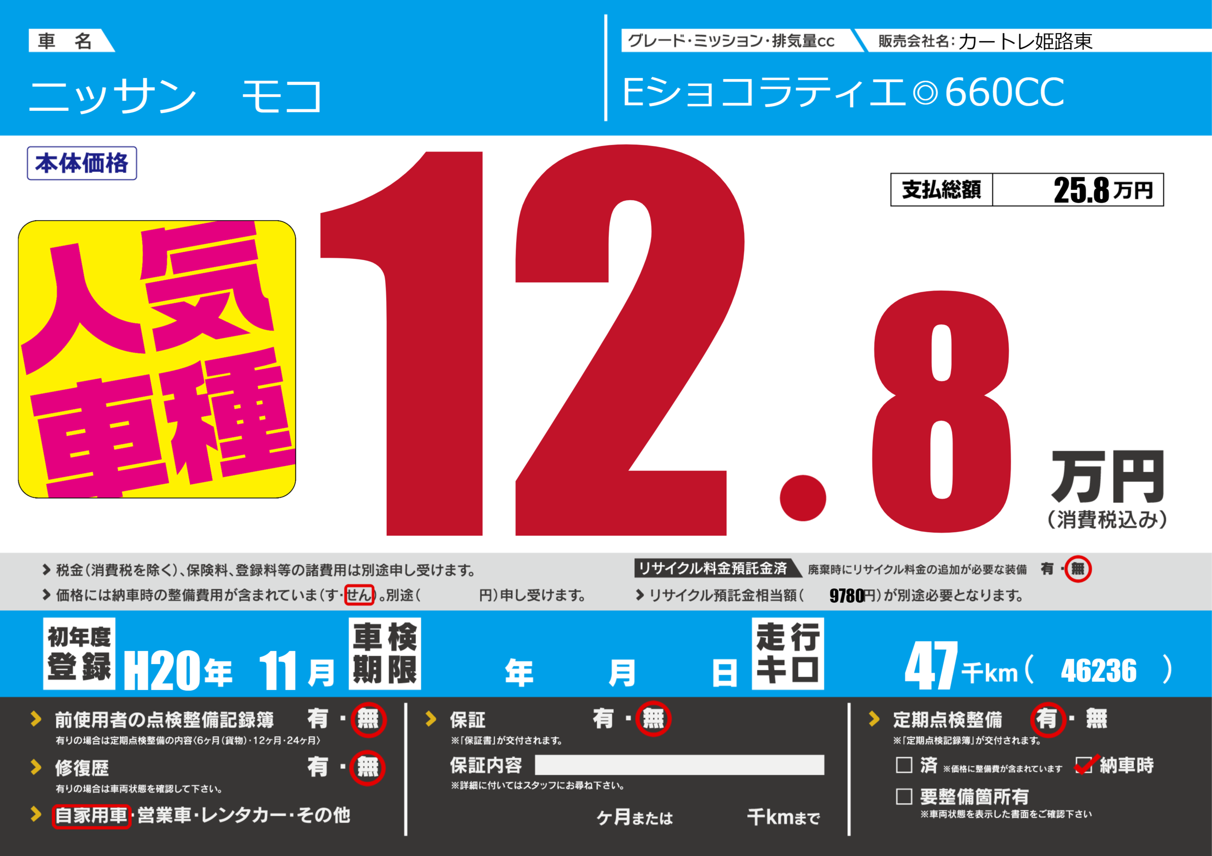 | 走行キロ | 4.7万km | 初年度登録 | H20年11月 |