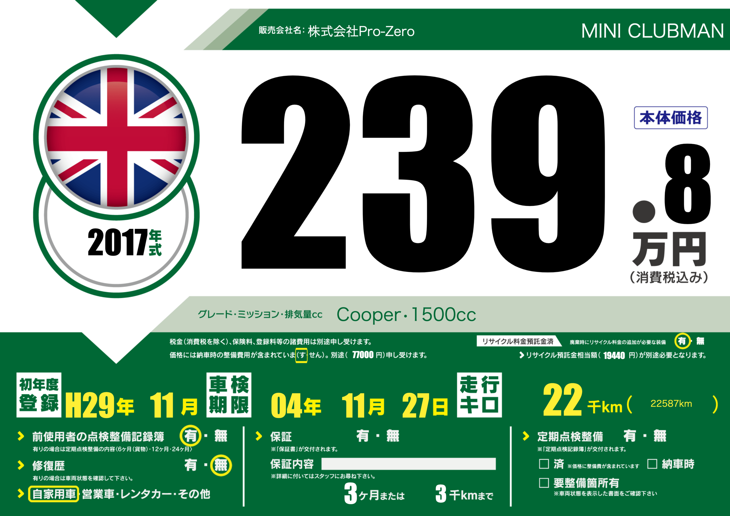 | 車名 | MINI CLUBMAN | グレード ミッション 排気量 |