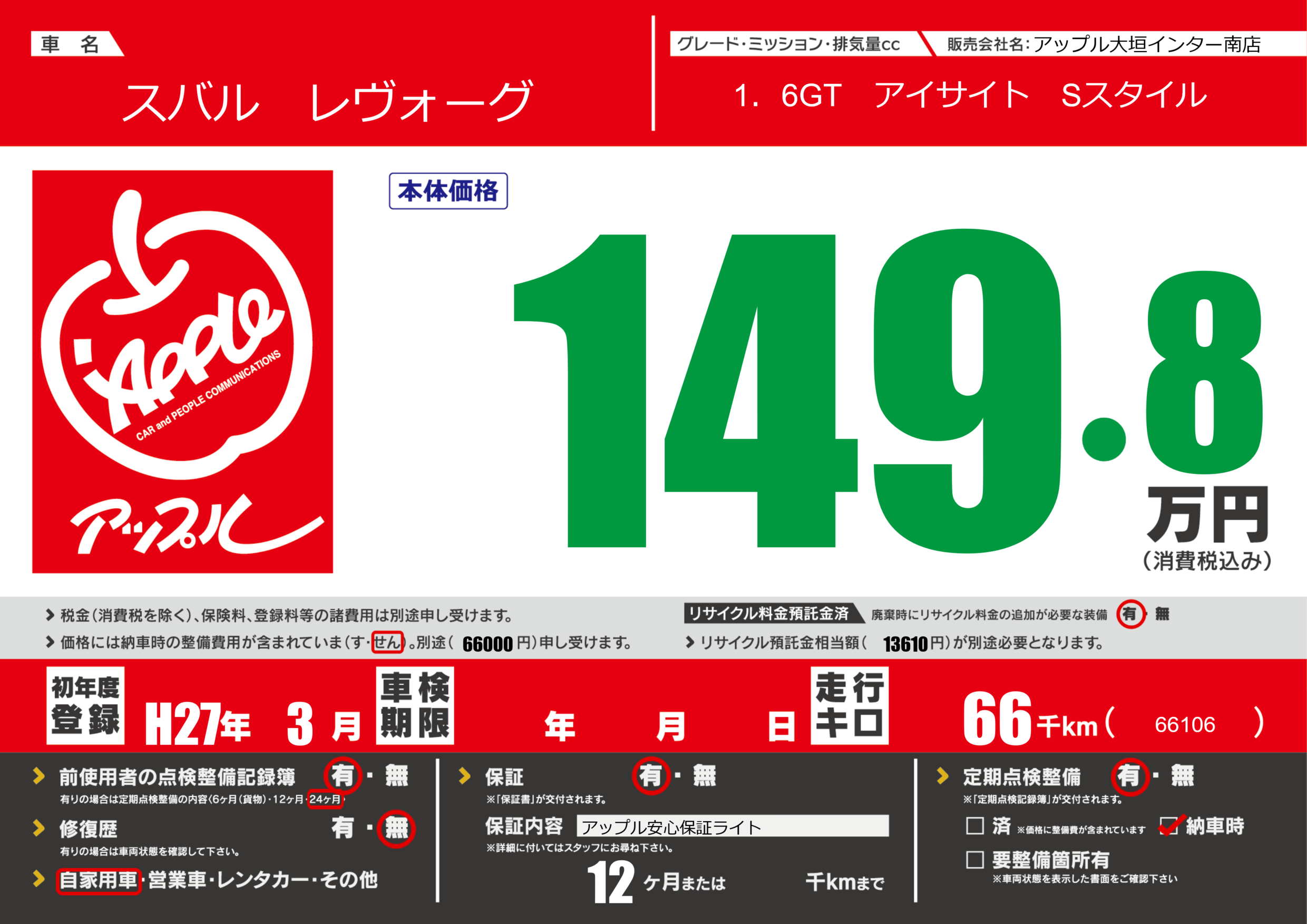 | 車名 | スバル レヴォーグ | グレード ミッション 排気量 |
