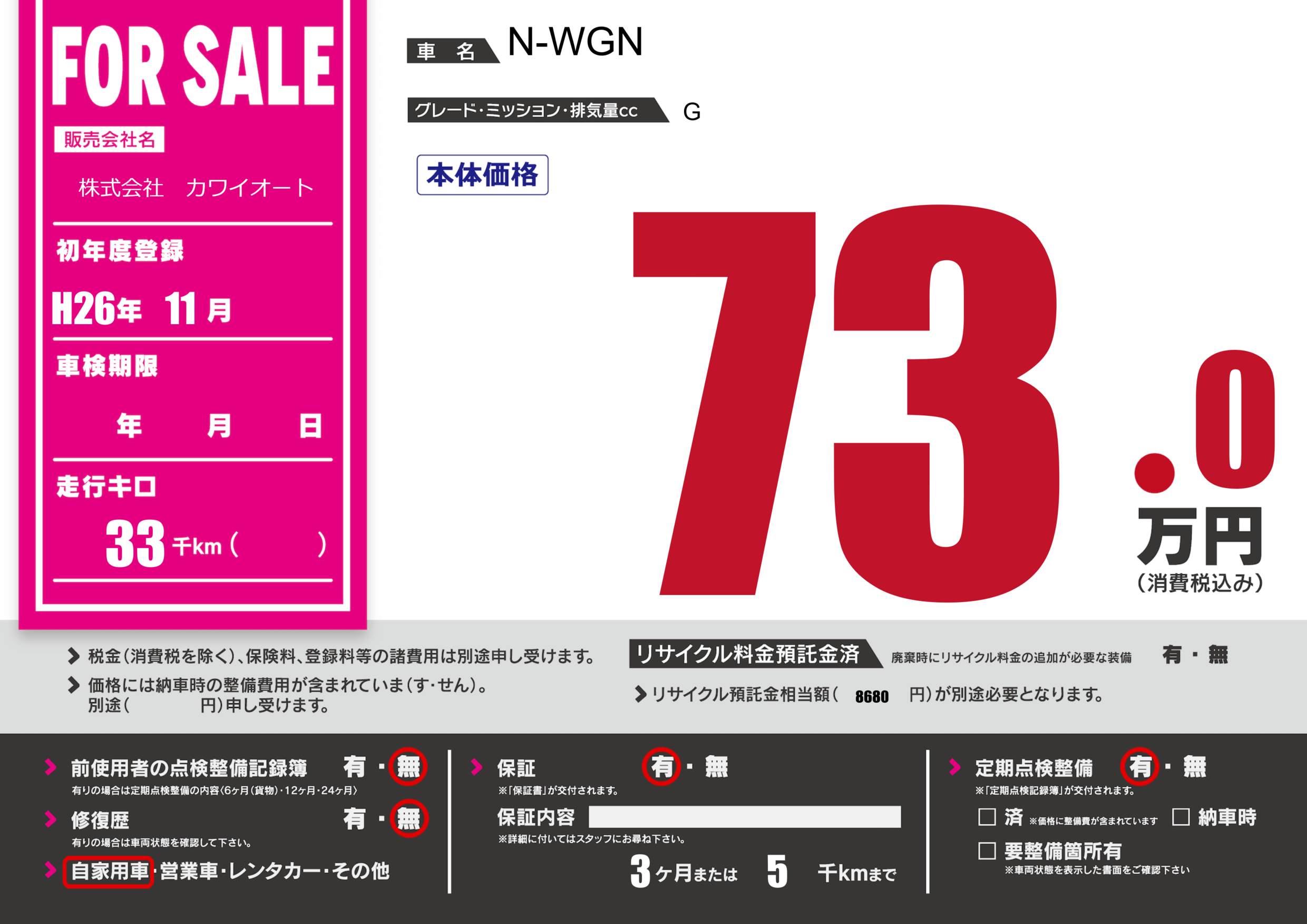 | 車名 | N-WGN | グレード ミッション 排気量 |