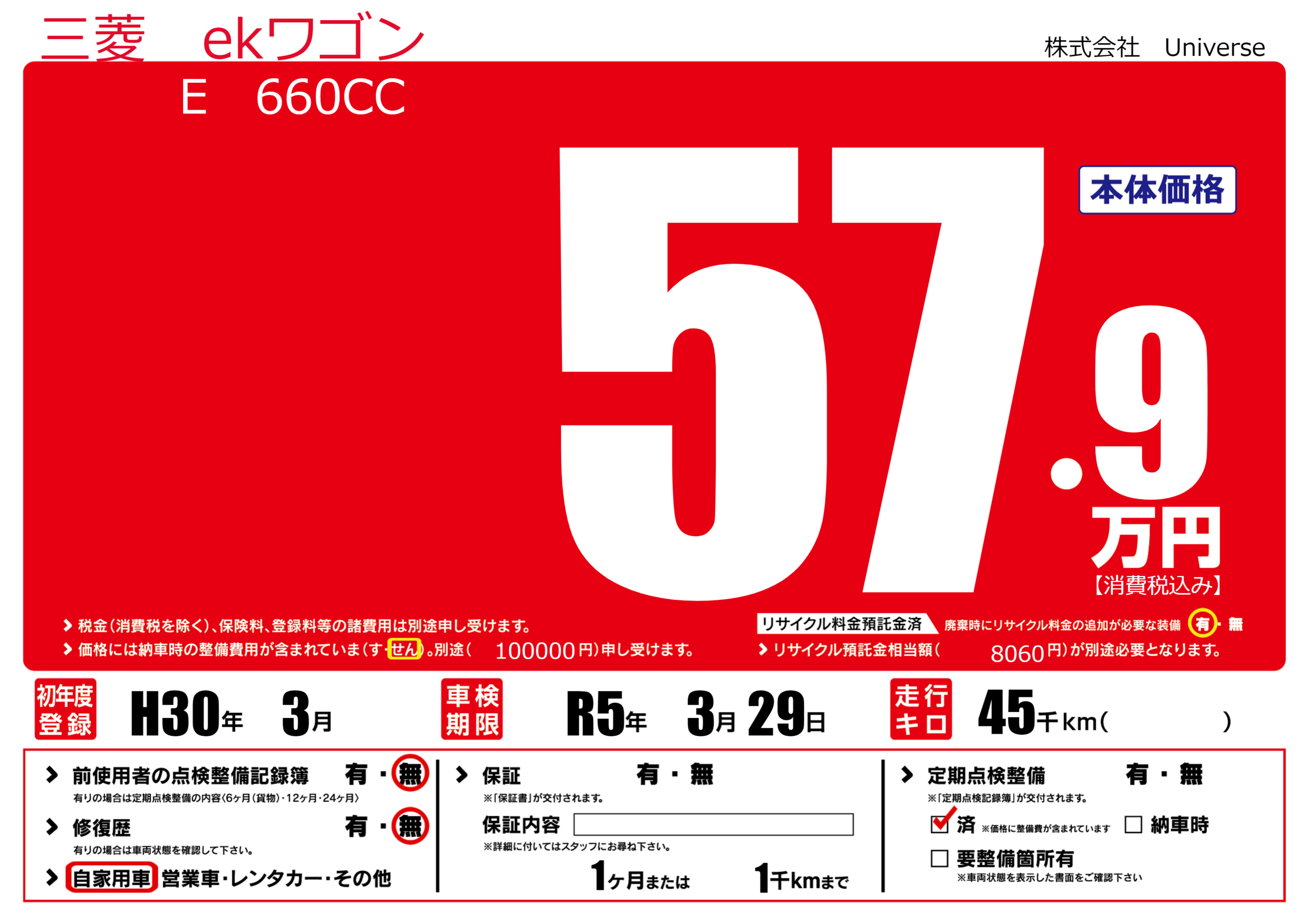 | 車名 | 三菱 ekワゴン | グレード ミッション 排気量 |