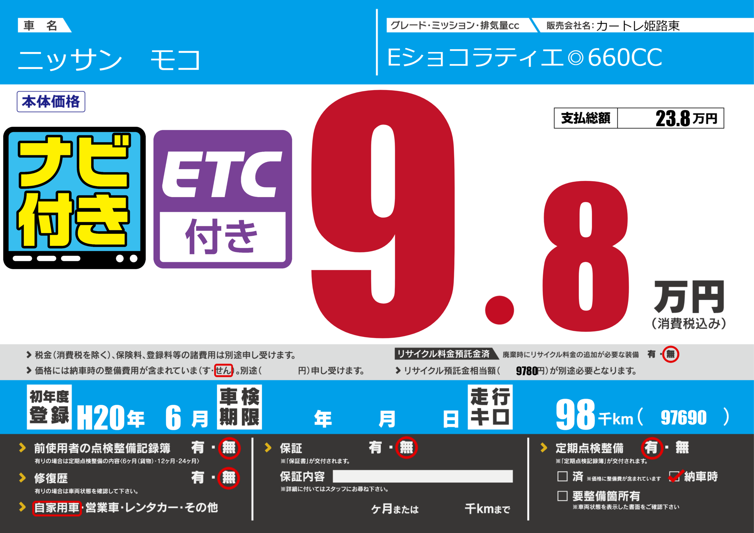 | 走行キロ | 9.8万km | 初年度登録 | H20年6月 |