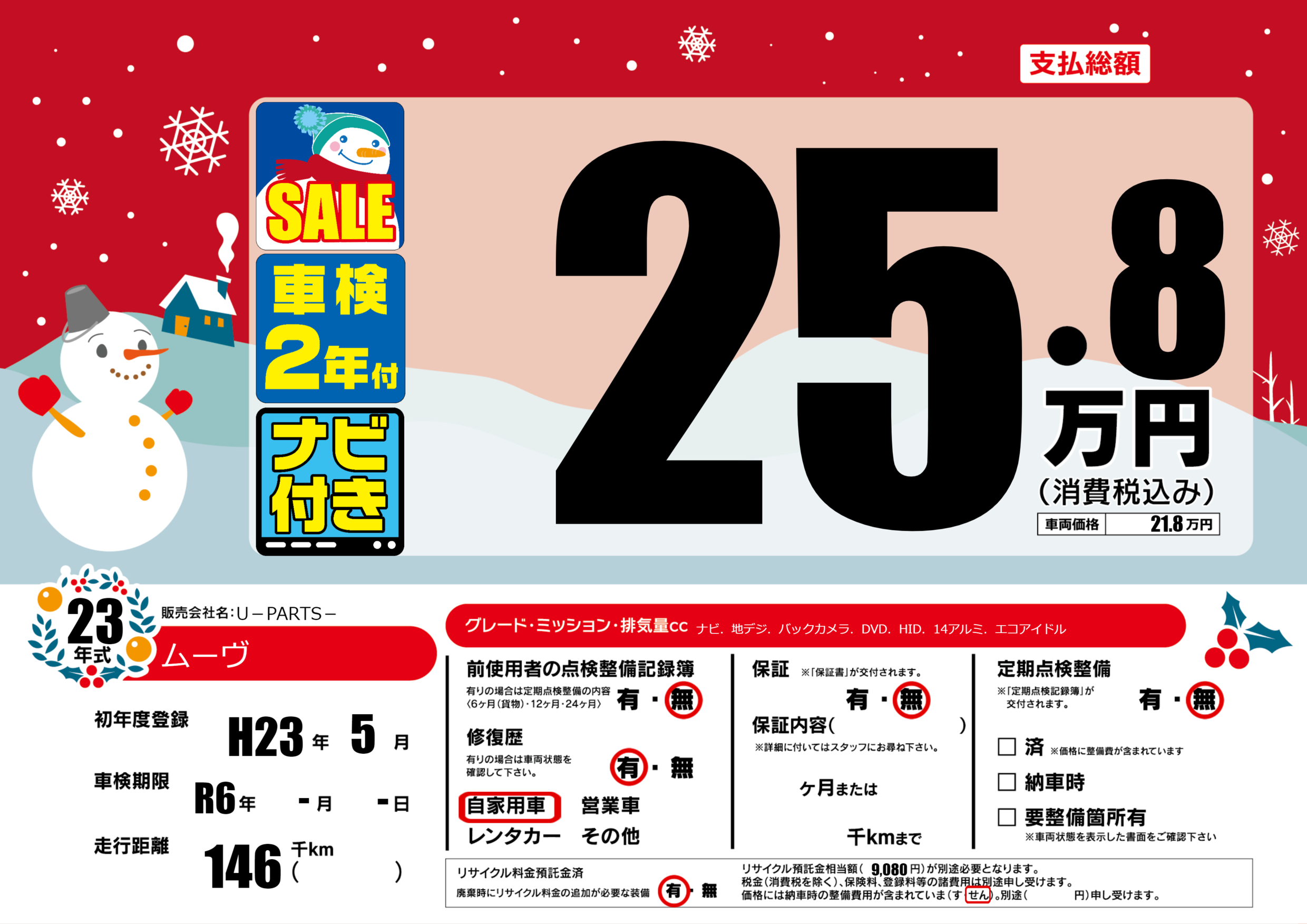 | 走行キロ | 14.6万km | 初年度登録 | H23年5月 |