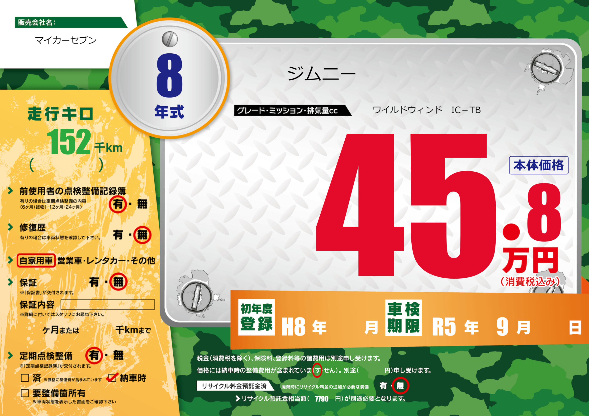 | 走行キロ | 15.2万km | 初年度登録 | H8年---月 |