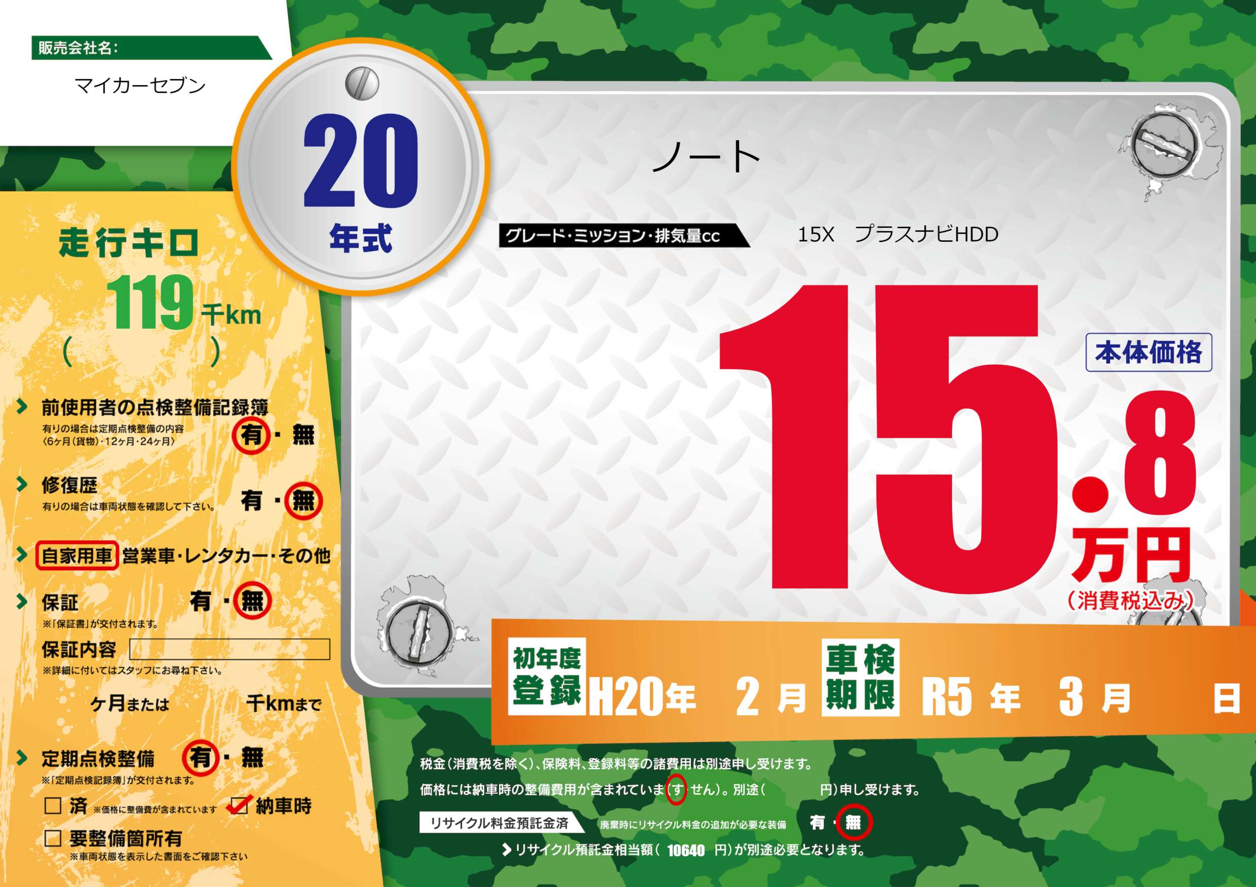 | 走行キロ | 11.9万km | 初年度登録 | H20年2月 |