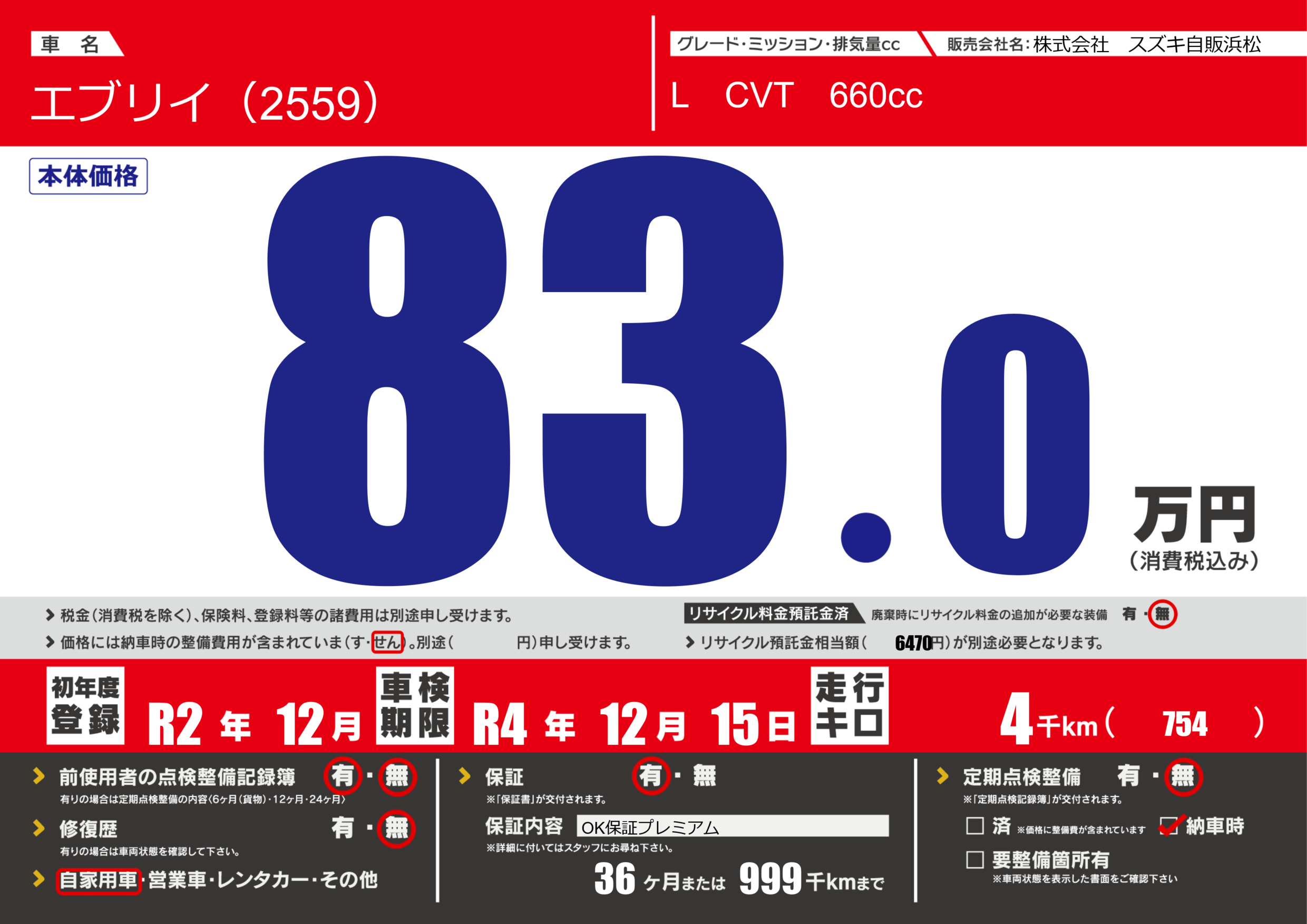 | 車名 | エブリイ(2559) | グレード ミッション 排気量 |