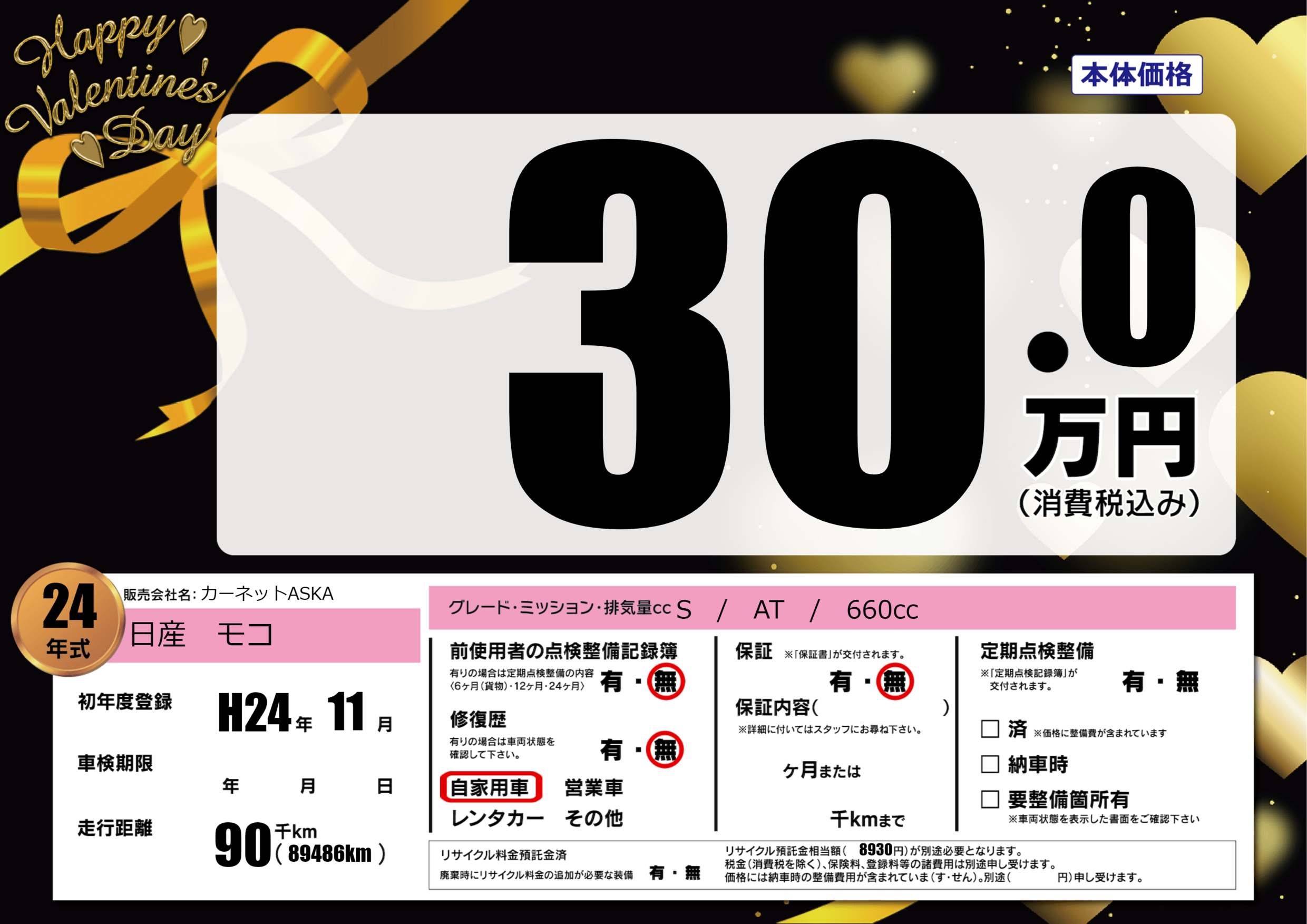 | 走行キロ | 9万km | 初年度登録 | H24年11月 |
