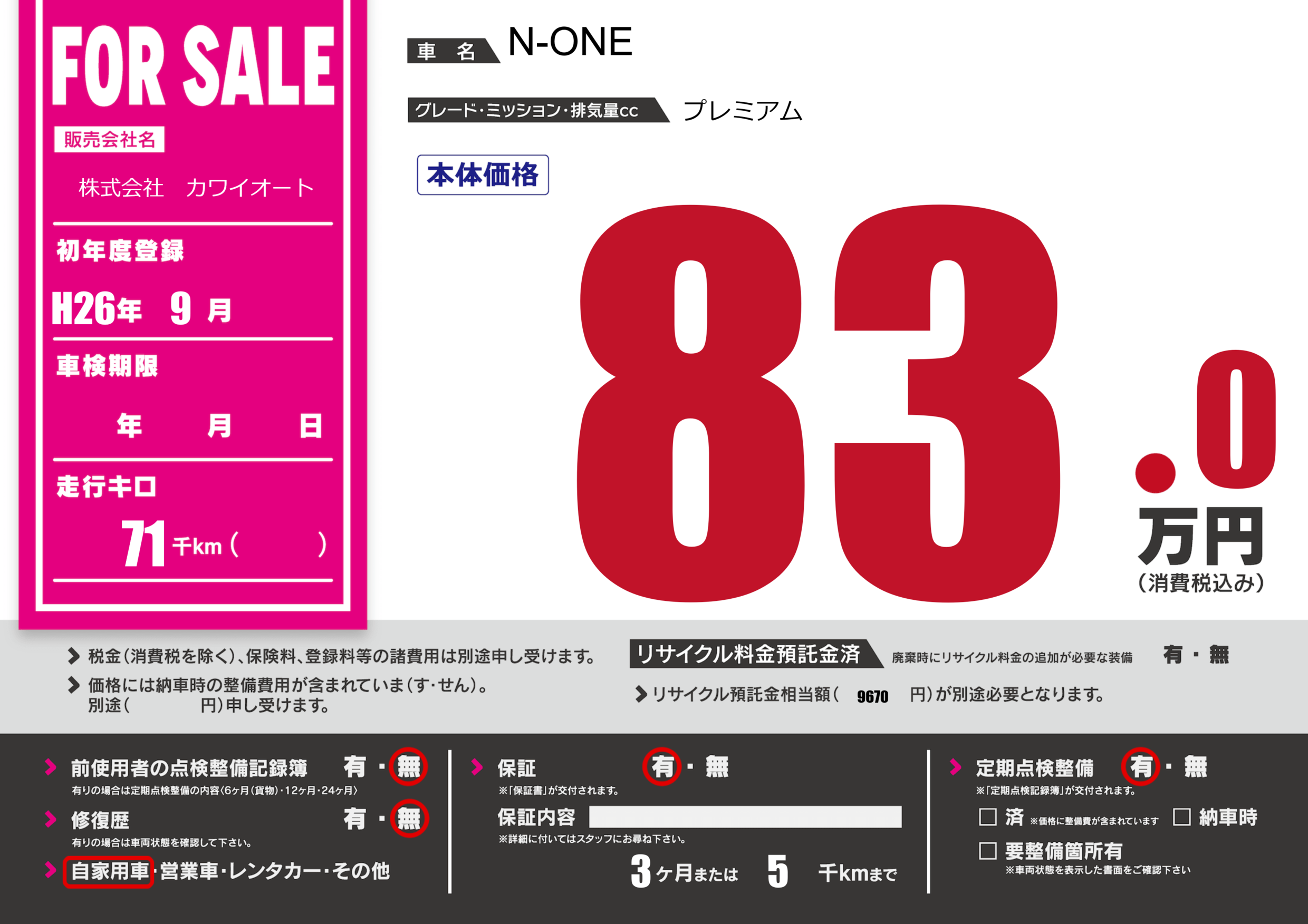 | 車名 | N-ONE | グレード ミッション 排気量 |