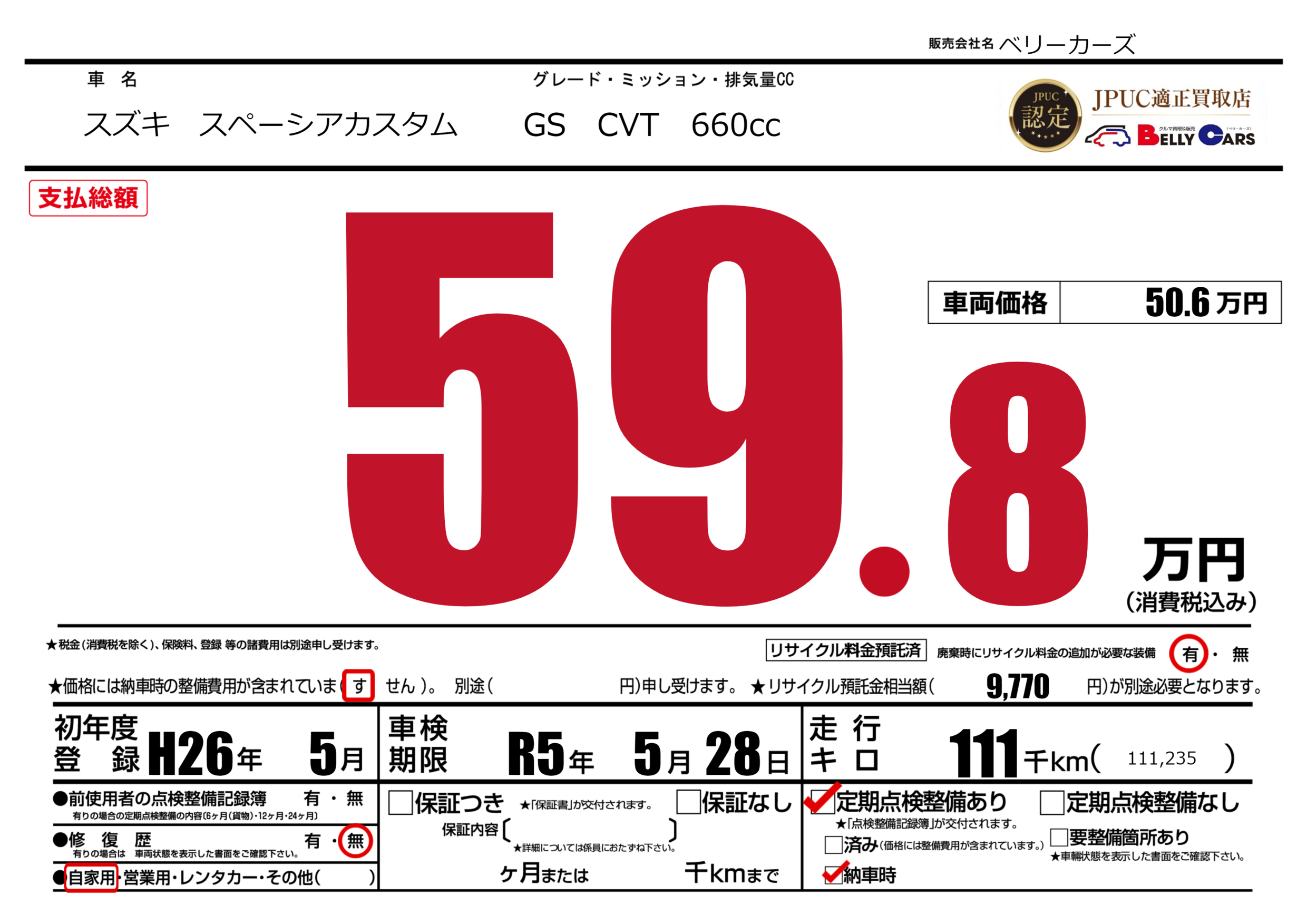 | 車名 | スズキ スペーシアカスタム | グレード ミッション 排気量 |