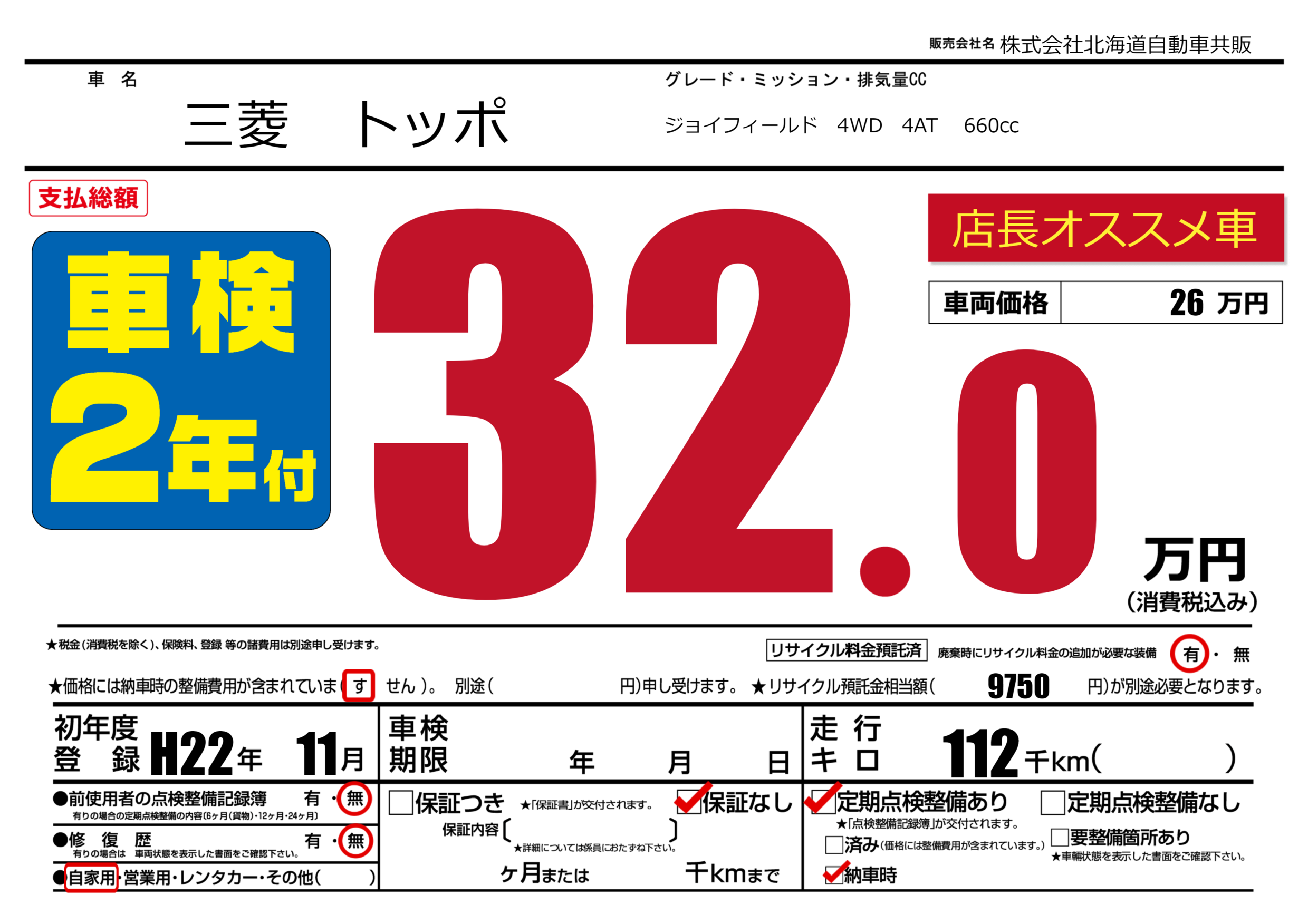 | 走行キロ | 11.2万km | 初年度登録 | H22年11月 |