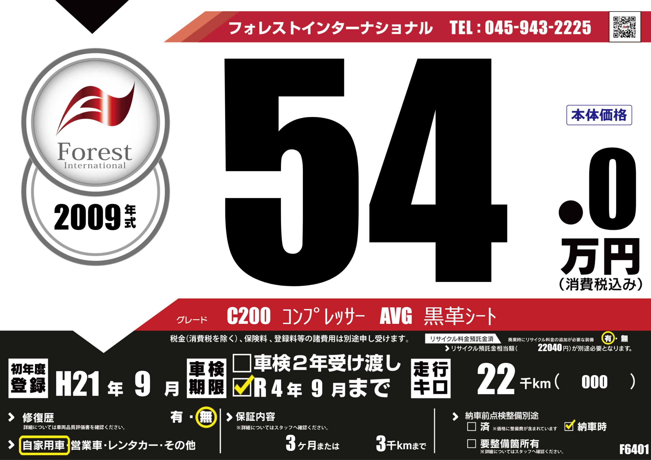 | 走行キロ | 2.2万km | 初年度登録 | H21年9月 |