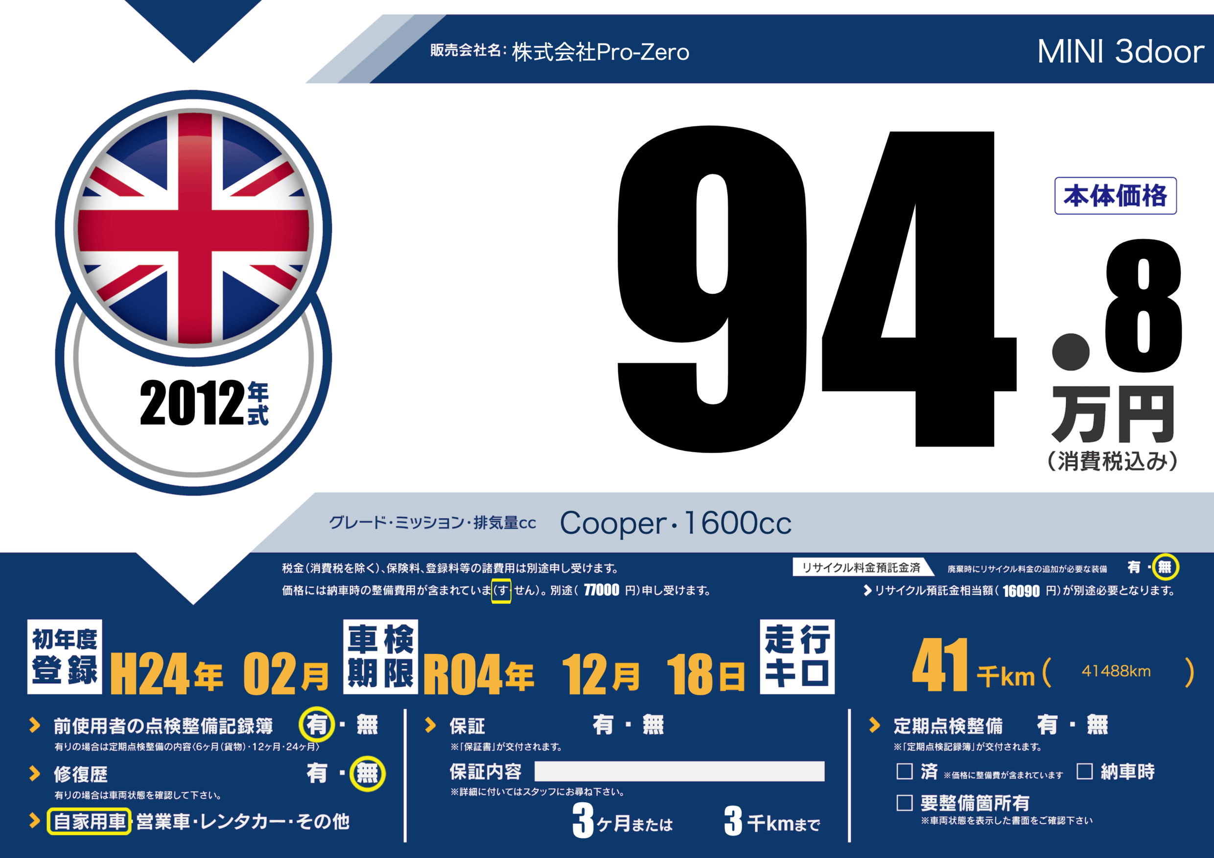 | 車名 | MINI 3door | グレード ミッション 排気量 |