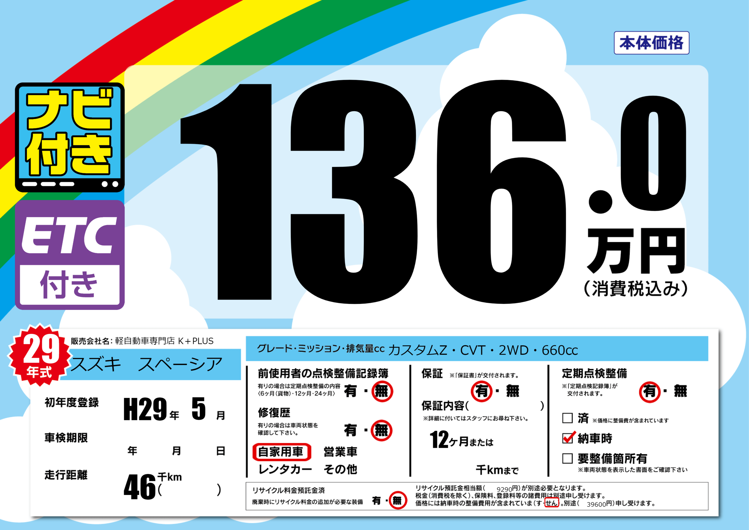 | 走行キロ | 4.6万km | 初年度登録 | H29年5月 |
