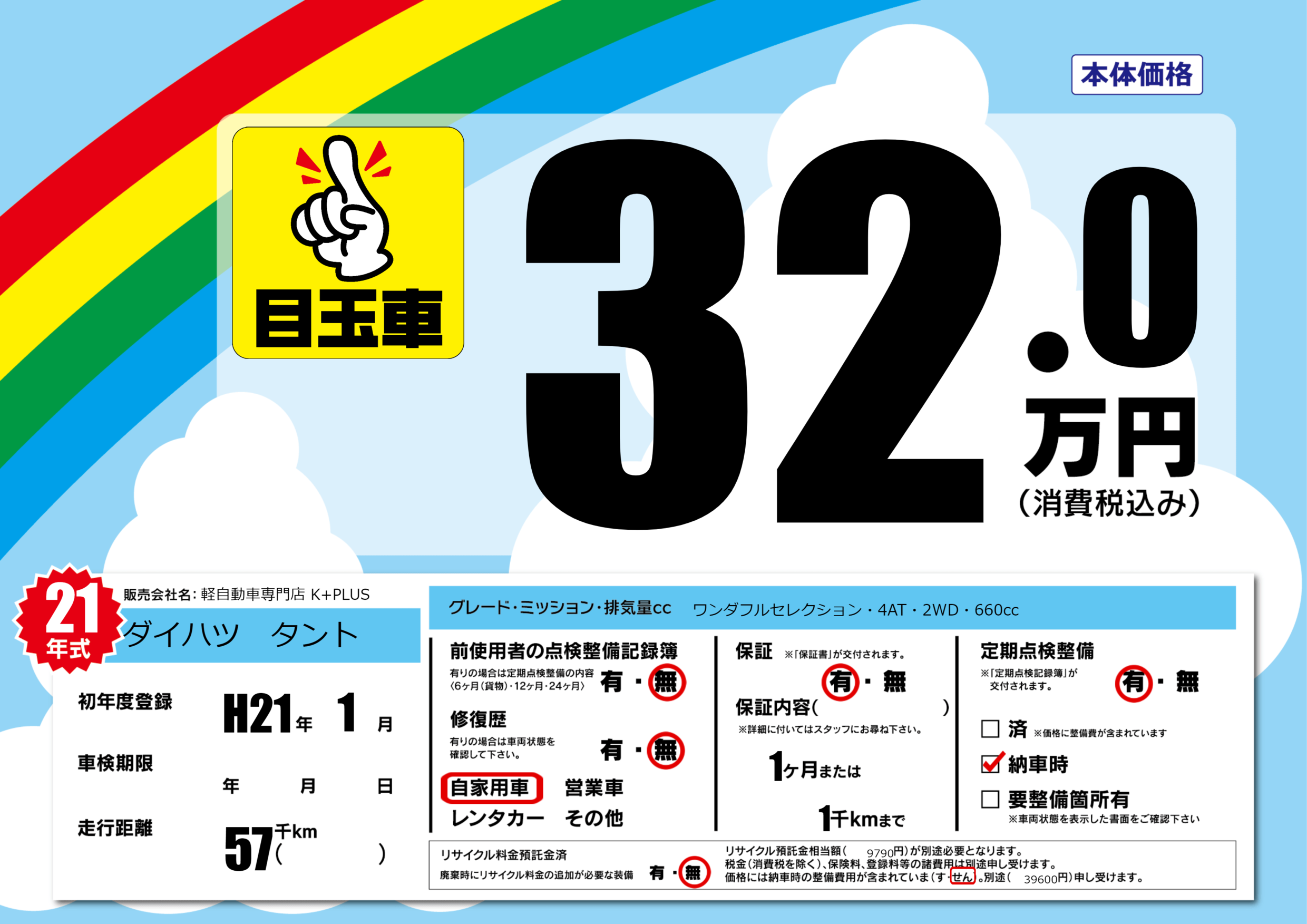| 定期点検整備 | 定期点検整備あり 納車時あり | ||