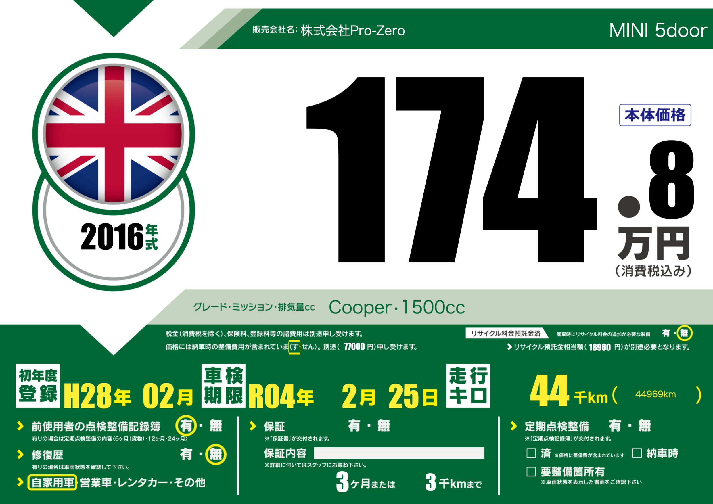 | 車名 | MINI 5door | グレード ミッション 排気量 |