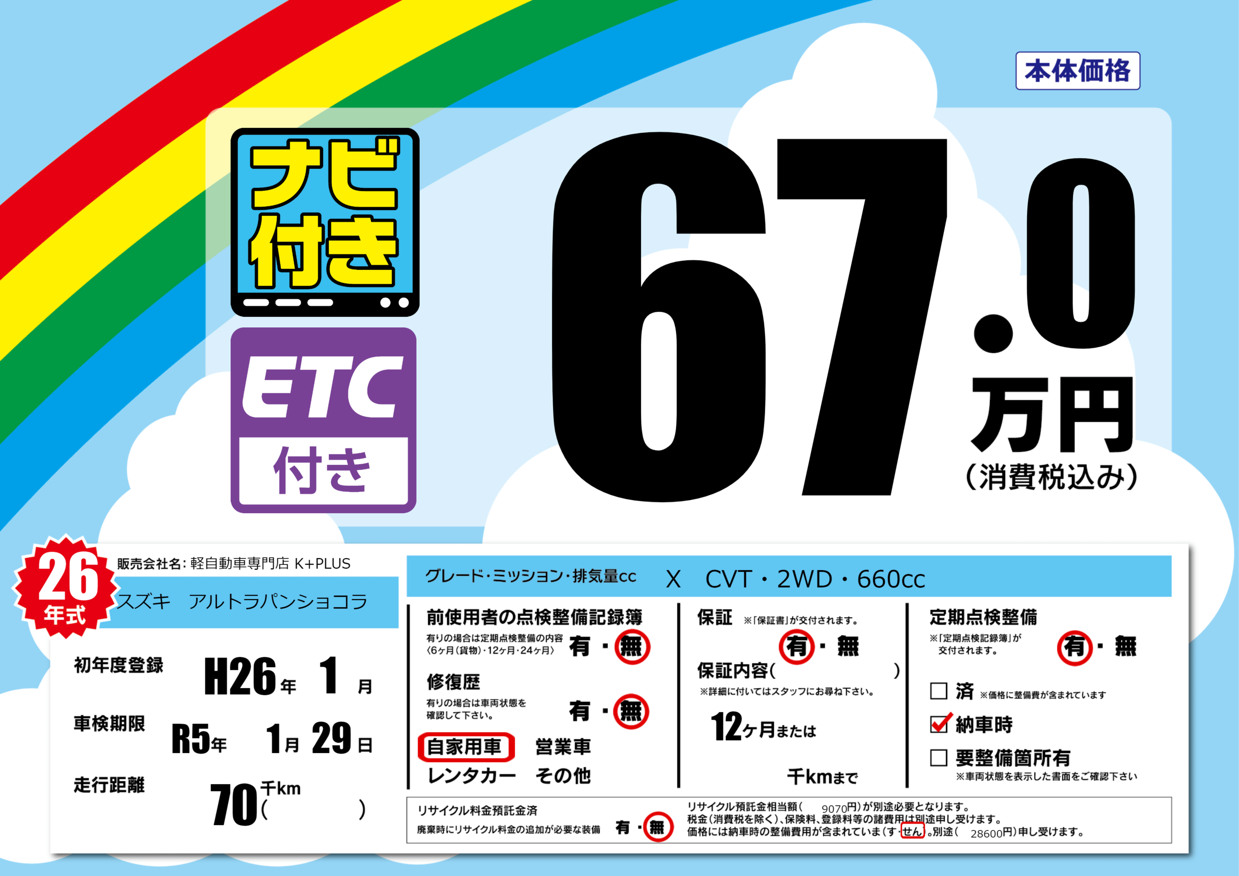 | 走行キロ | 7万km | 初年度登録 | H26年1月 |
