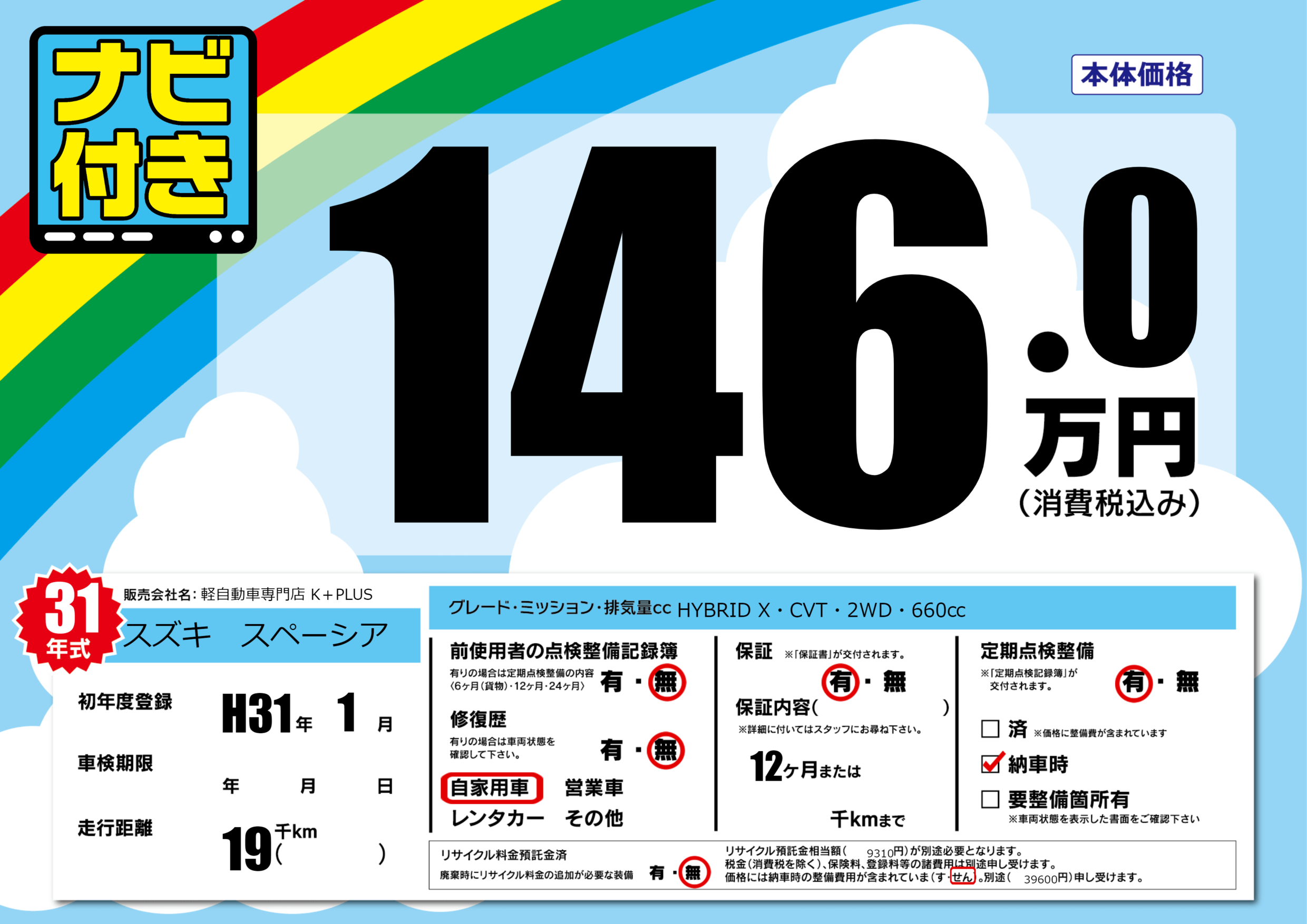 | 走行キロ | 1.9万km | 初年度登録 | H31年1月 |