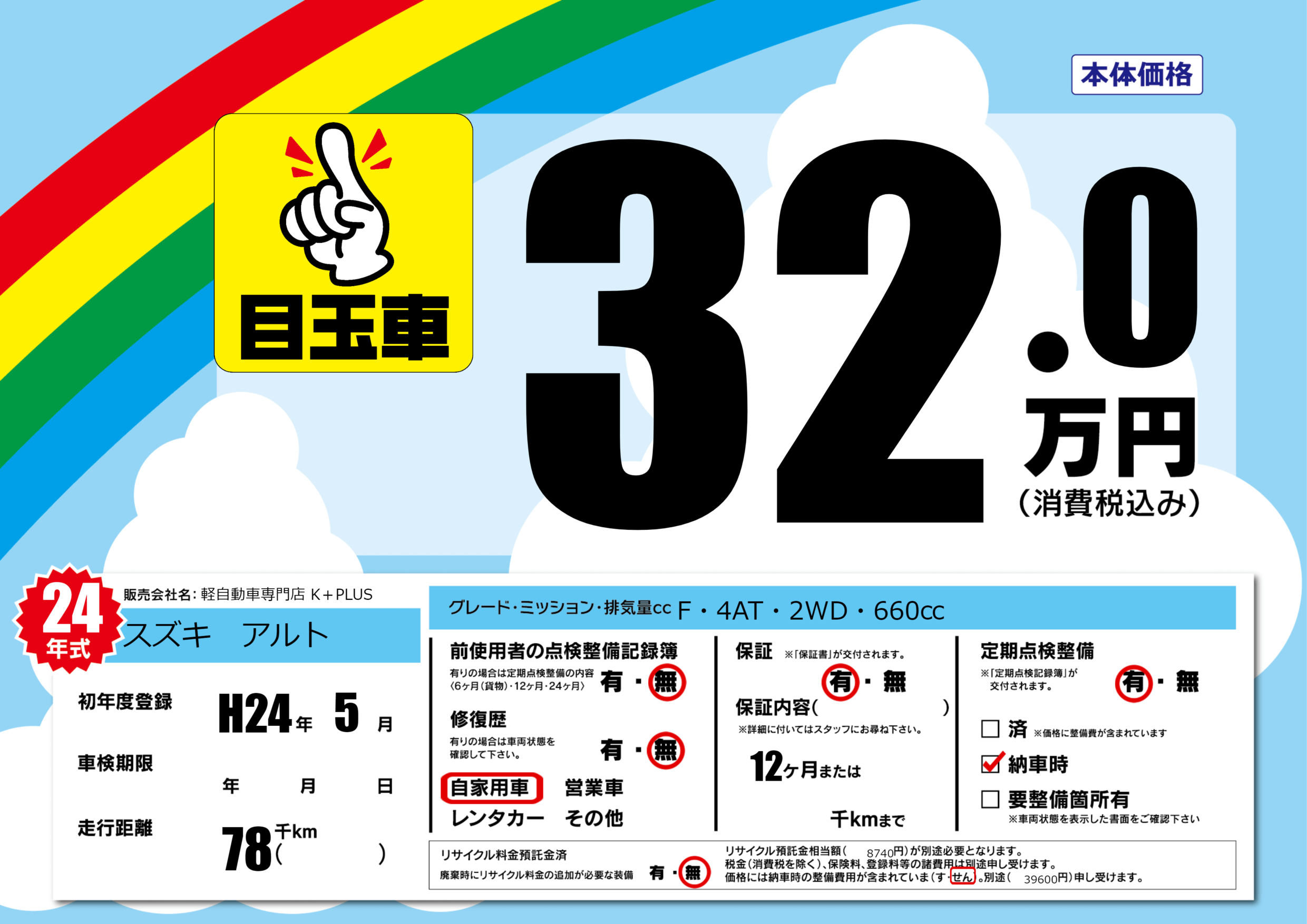 | 車名 | スズキ アルト | グレード ミッション 排気量 |