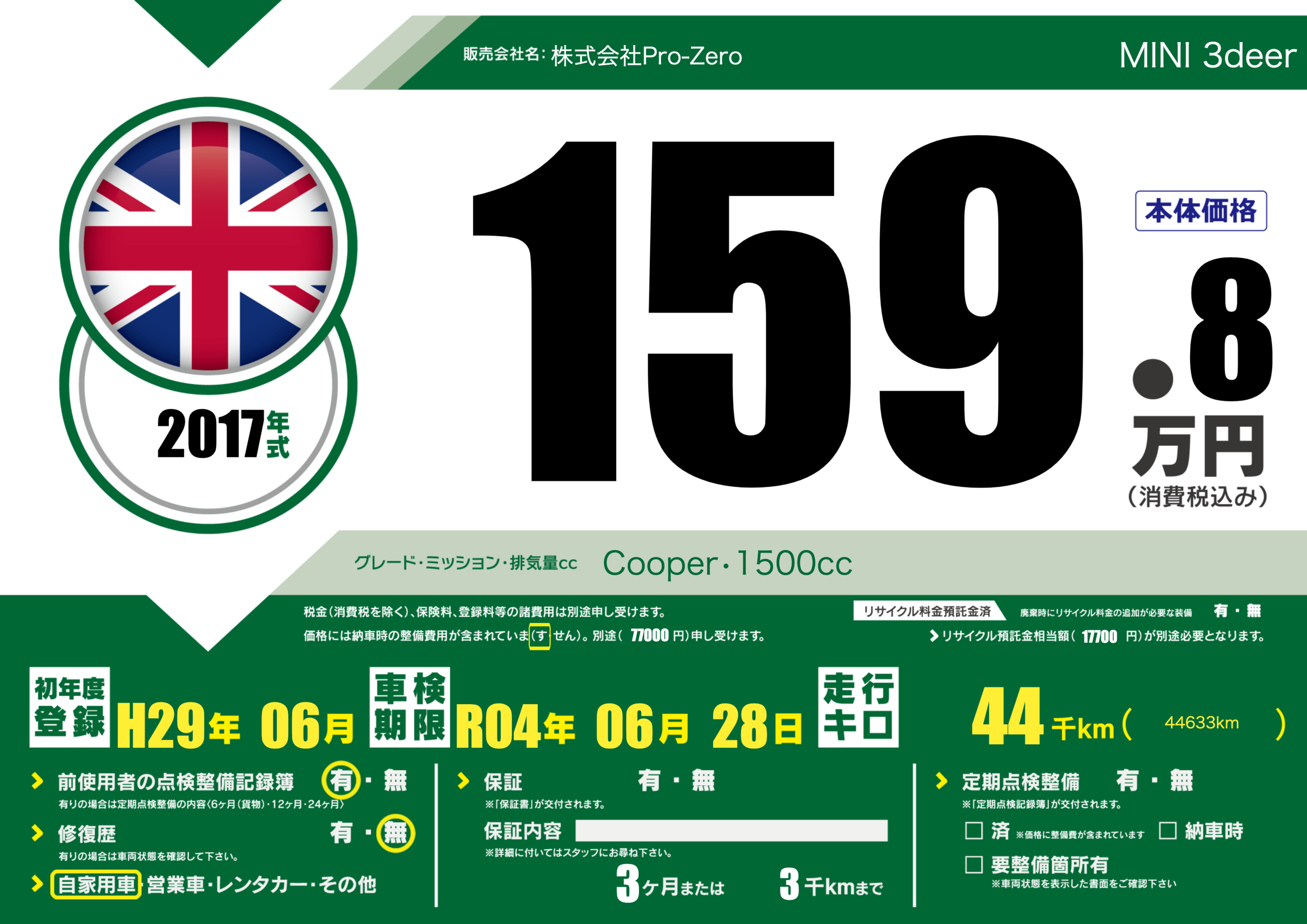 | 車名 | MINI 3deer | グレード ミッション 排気量 |