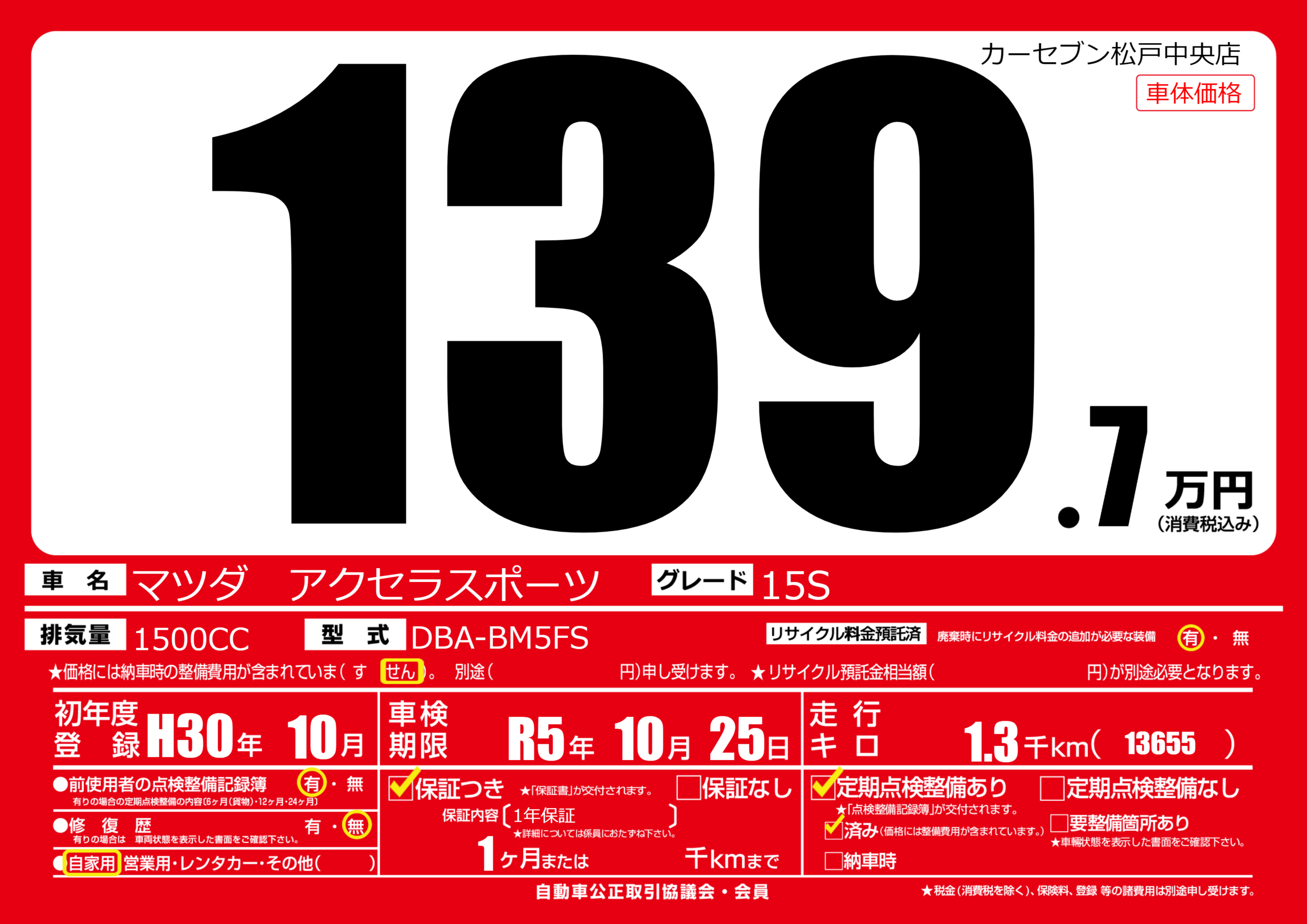 | 車名 | マツダ アクセラスポーツ | グレード ミッション 排気量 |