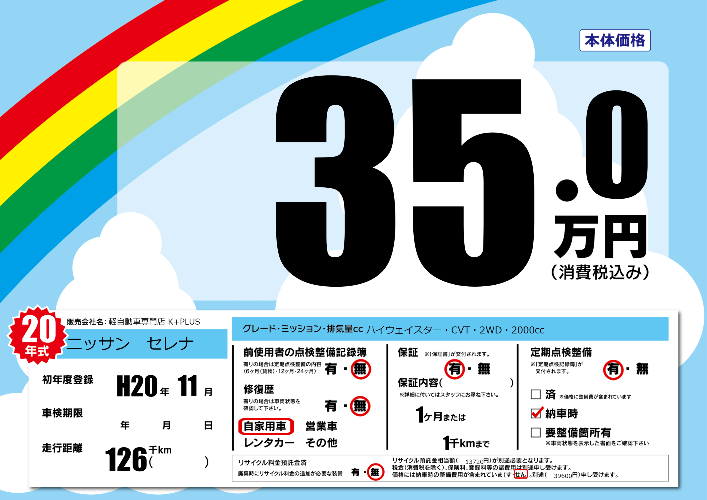 | 走行キロ | 12.6万km | 初年度登録 | H20年11月 |